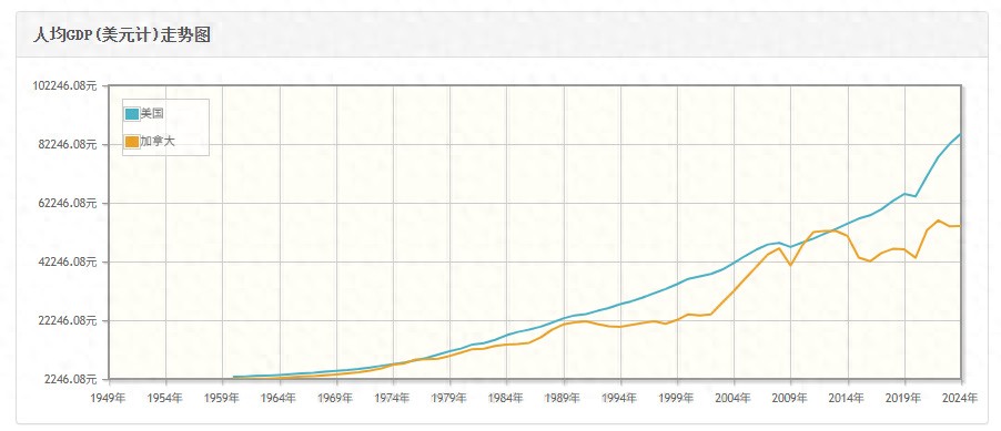2023年美国人均GDP高达8.5万美元,加拿大仅为5.4万美元,差距近60%。更糟糕的是,这一差距还在持续扩大。为何资源丰富、社会稳定的加拿大,人均GDP却远逊于邻国?诱因主要有三个方面。