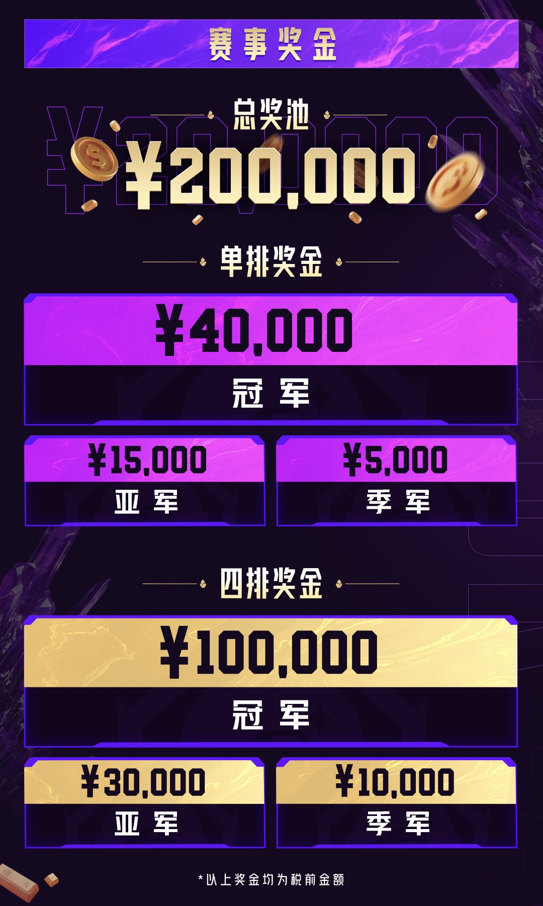 S3赛季为单排及四排赛道均设置了冠、亚、季军奖金,赛季总奖金池规模达到20万元。其中,单排赛道的冠军将独享4万元奖金,而四排赛道冠军更是可狂揽10万元巨额奖励,充分激励着所有顶尖选手向冠军荣誉发起冲击。
