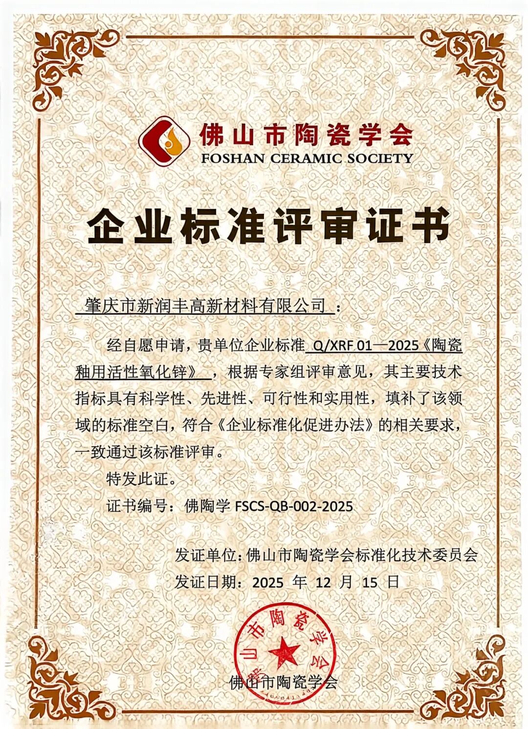 本次《陶瓷釉用活性氧化锌》企业标准评审会暨媒体见面会的成功举办,不仅是新润丰企业发展历程中的一个重要里程碑,也是陶瓷产业链上下游协同创新、共谋标准升级的生动实践。它彰显了领先原料企业以前瞻视野主动担当,通过标准化工作将创新力转化为行业推动力的决心。随着该标准的最终完善与实施,必将为陶瓷行业响应国家高质量发展号召、攀登5A品质高峰,提供不可或缺的原料技术支撑,共创行业新未来。