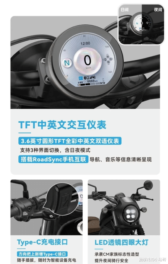 CM300的配置只能用“务实”形容,没有花里胡哨的功能,但核心安全配置没含糊。2026款升级了TFT仪表,终于告别了老款简陋的机械仪表,车速、油耗、续航这些信息一目了然,虽然没有导航投屏、车机互联这些功能,但对普通人来说完全够用。全LED灯组亮度够用,危险警报灯、滑动离合器都是标配,日常骑行的便利性和安全性有保障。