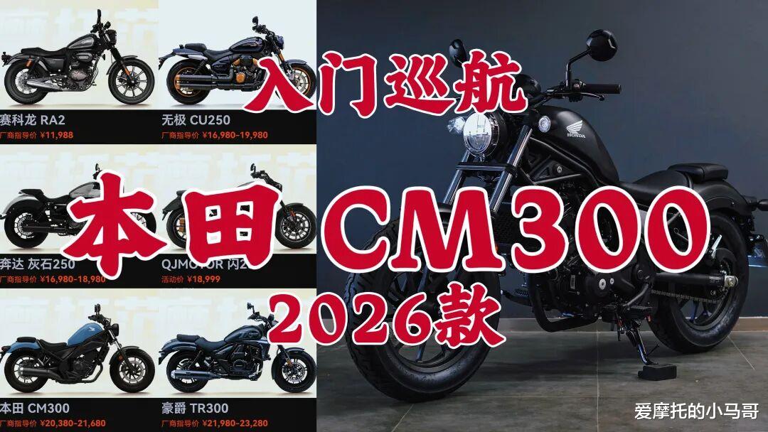 入门巡航怎么选?想必很多人大概率会在本田CM300和国产同级车型里纠结——一边是本田的品牌光环、稳如老狗的品控,一边是国产车型的配置堆砌、双缸声浪。以前这种纠结情况可能并不多,毕竟那时候本田还高高在上呢,不加价提车的情况下裸车价就已经3.5万了,而如今2025款的标准版价格居然是20380元,近乎腰斩!不过最近更新的2026款居然迎来了一波小涨,分别是20980元的智享版和21680元的臻享版,敢这么玩,是因为国产还打不过它么?
