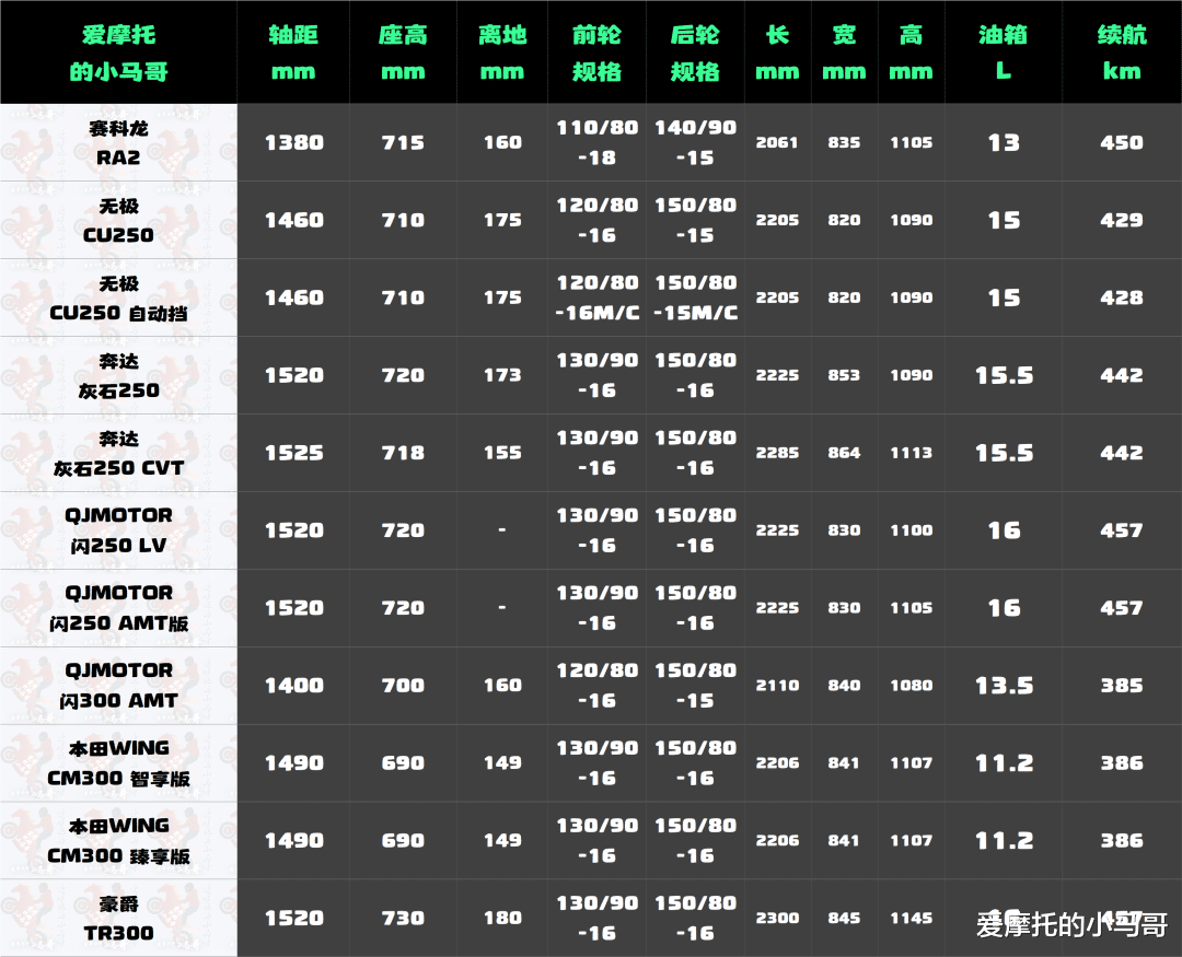 日常通勤的话,CM300的表现还算合格。11.4L的油箱,综合油耗大概2.9L/100km,满油能跑350公里以上,一周加一次油完全够用,养车成本很低,小保养一次也就两百多,本田的维修网点遍地都是,不用为售后发愁。骑行姿势直立舒展,手把位置合适,市区骑一两个小时也不会觉得累。