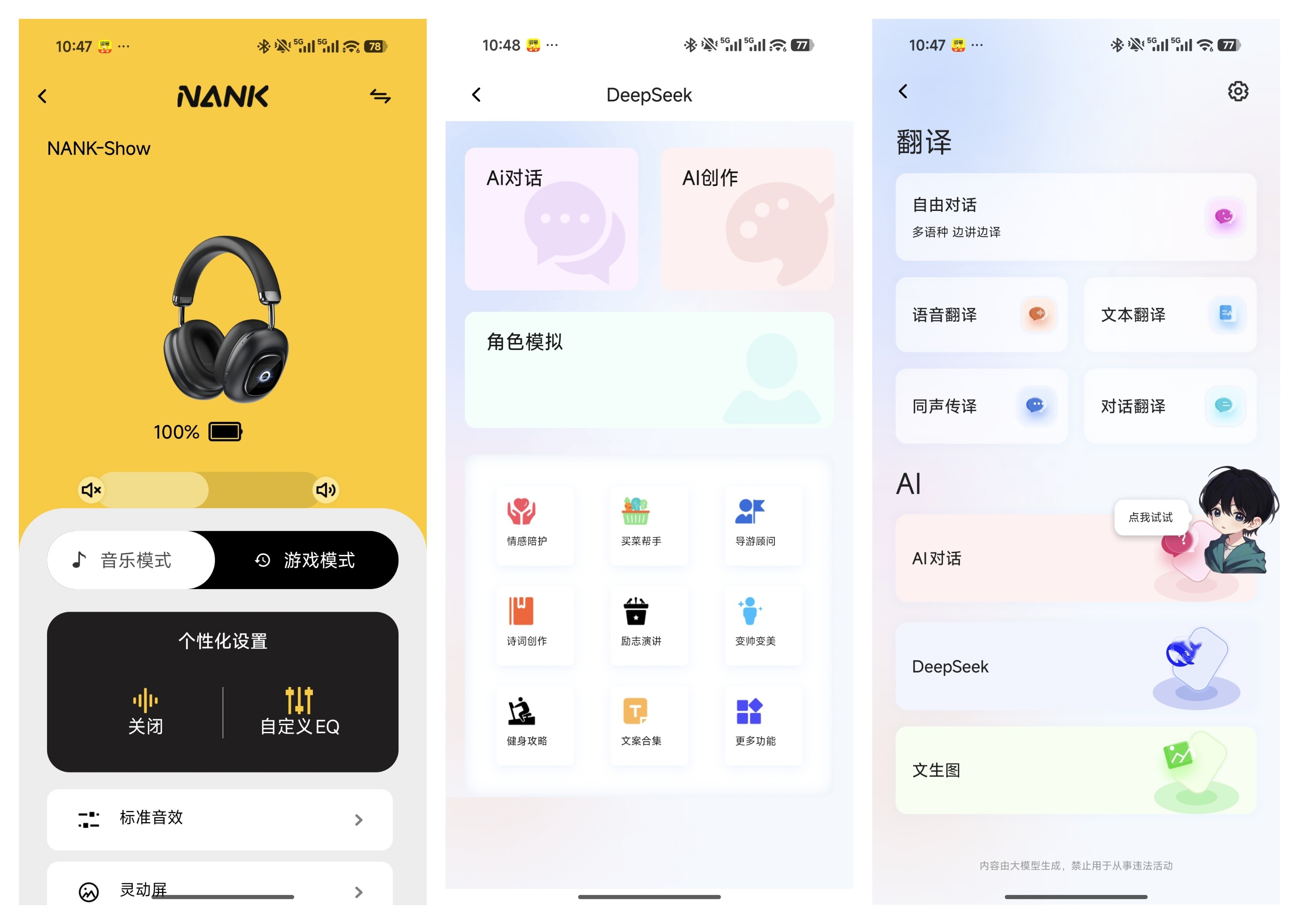 如果说灵动屏和音质是南卡Show的基础,那多模态AI引擎就是它的“智能灵魂”,也是区别于同价位产品的核心竞争力。耳机整合讯飞×DeepSeek全模加持的多模态AI能力,真正实现了“耳机不止听音,更能贴心助手”的体验升级:日常办公时,一键唤醒AI就能实现语音转文字、内容创作,写方案、记笔记再也不用手动敲字;出国旅行或与外籍友人交流时,实时翻译功能秒速响应,支持多语种互译,沟通零障碍;闲暇时还能与AI智能对话,查资讯、定提醒、聊日常,一句话就能搞定;甚至在创作时,还能让AI帮忙构思文案、梳理思路,真正将AI能力融入听、说、写、译的全场景,让头戴式耳机从“音频设备”进化为随身智能终端。