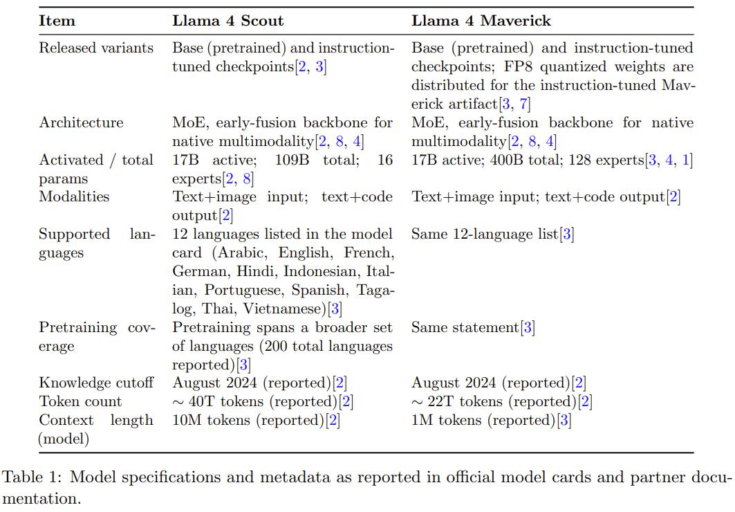 在主要服务环境中观察到的实际部署限制,包括特定于提供商的上下文限制和量化打包。 此外,这份报告还总结了「与再分发和衍生命名相关的许可义务,并回顾了公开描述的安全措施和评估实践。其目的是为需要关于 Llama 4 精确、有来源依据事实的研究人员和从业者提供一份紧凑的技术参考。」
