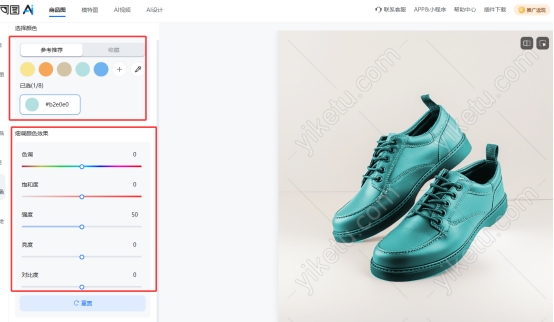 在选择目标颜色后,还可以进一步调节色调、饱和度、亮度和对比度,让改色后的商品更贴近真实质感,而不是简单选一个色彩进行覆盖。