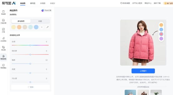易可图的商品换色功能是支持一次性上传多张图片,最多可同时处理 30 张,图片尺寸在规定范围内即可。