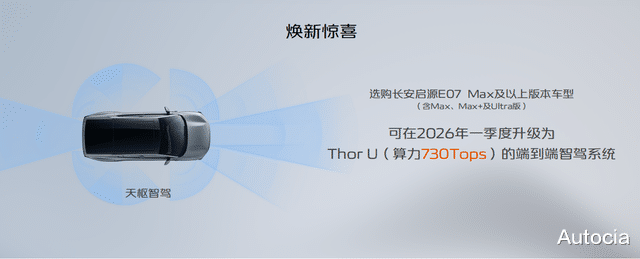 值得一提的是,品牌方还为消费者带来“焕新惊喜”。基于长安汽车全栈自研的SDA天枢架构所具备的“硬件可插拔”能力,长安启源E07 Max及以上版本车型(含Max、Max+及Ultra版),预计将在2026年一季度升级搭载高算力Thor U(算力730Tops)的端到端智驾辅助系统,让用户畅享更智能、更安全的城区智驾体验。