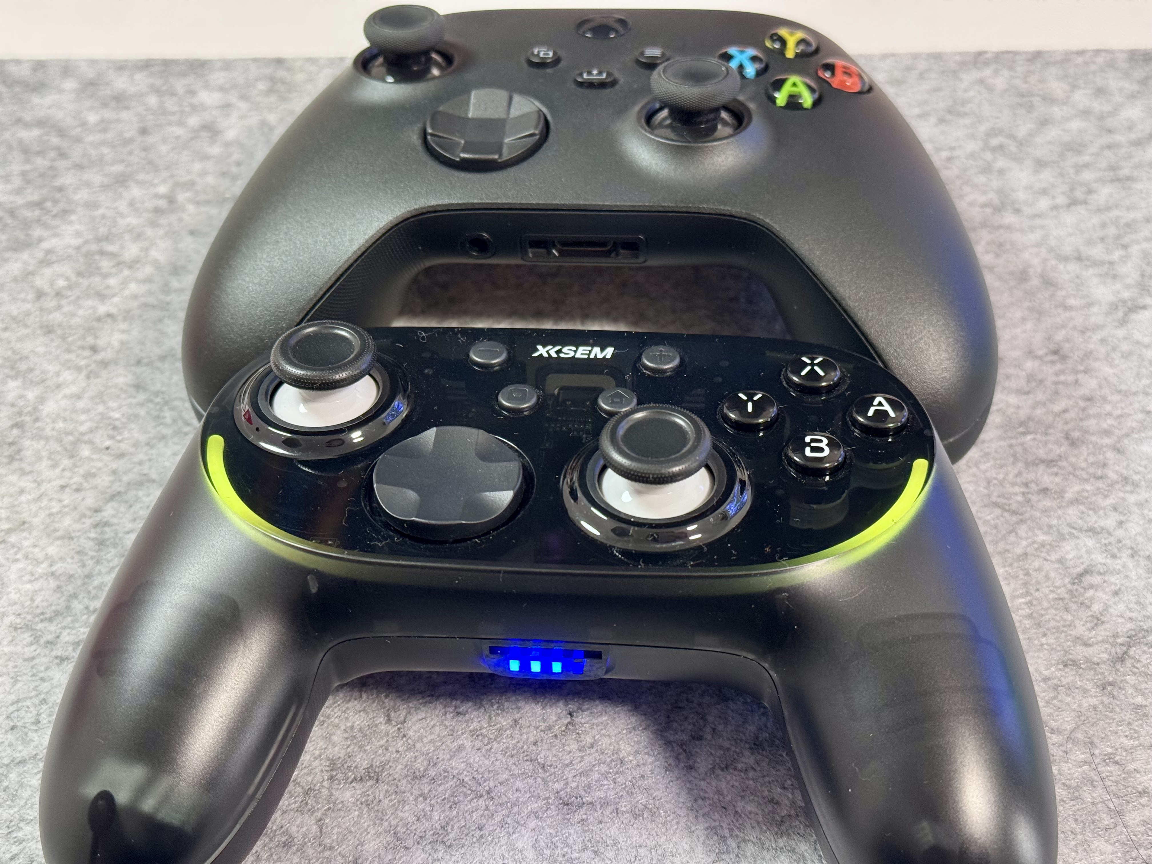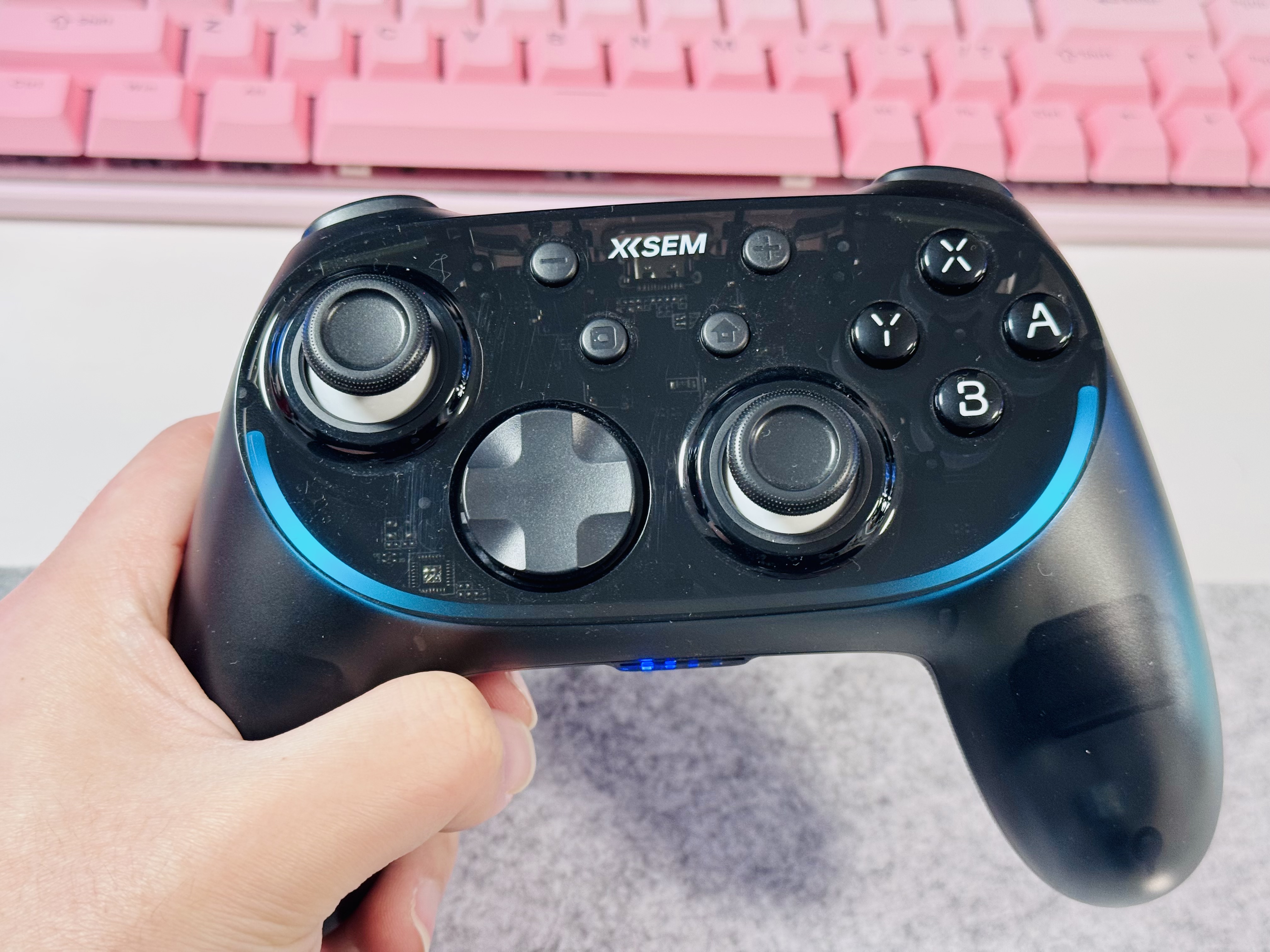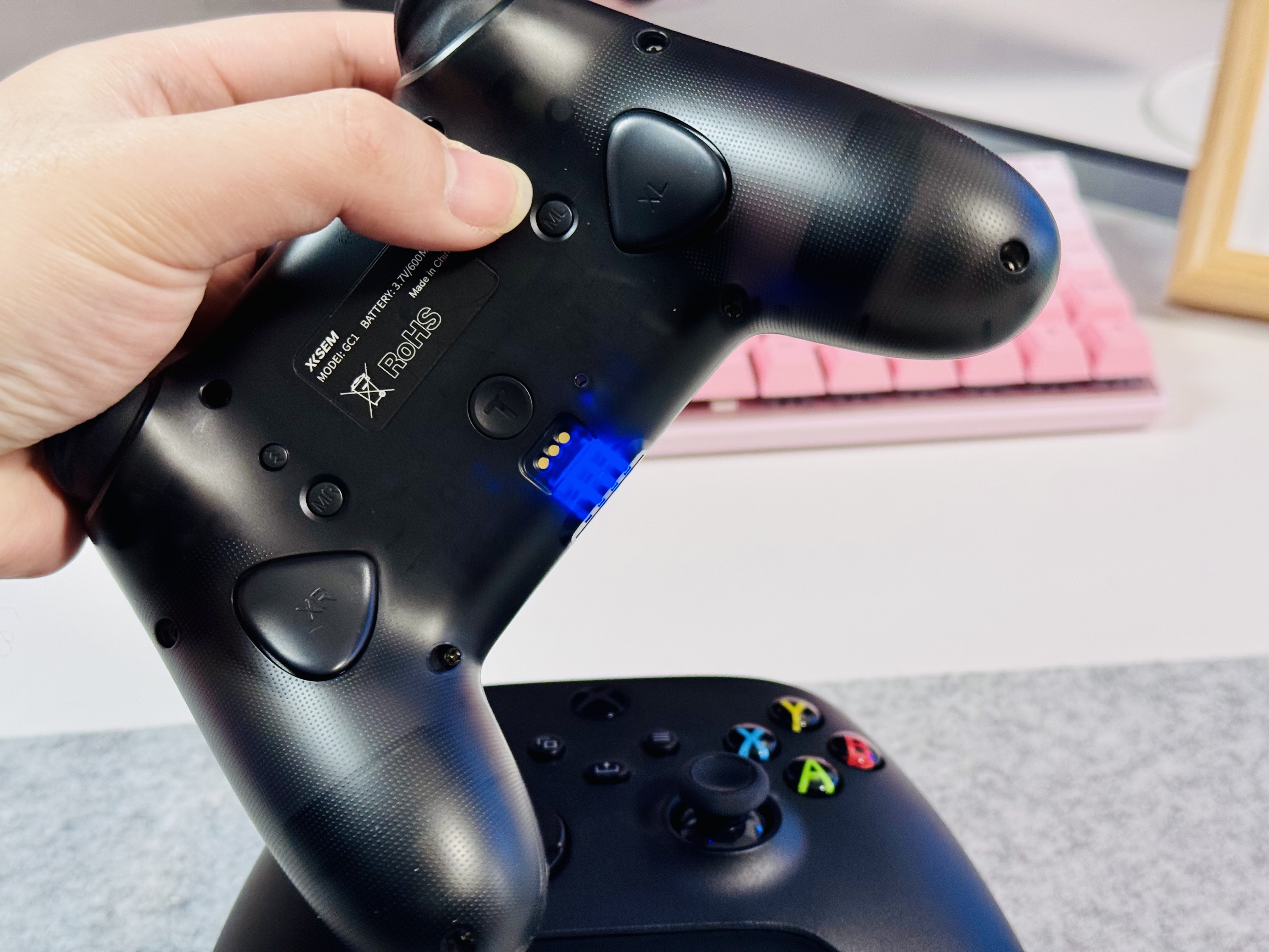 另外按键上,Xbox的XYBA四个键按着有点塑料感,而西圣GC1给人的反馈会更好些。对于RT和LT的设计,两家设计也不太一样,Xbox能按得更深,按下去反馈更强,而西圣GC1比较浅,有点像普通按键那样。西圣GC1这样设计得好处就是不需要太长距离触底,很快能给出反应,延迟更低,而Xbox这样质感会更好些。