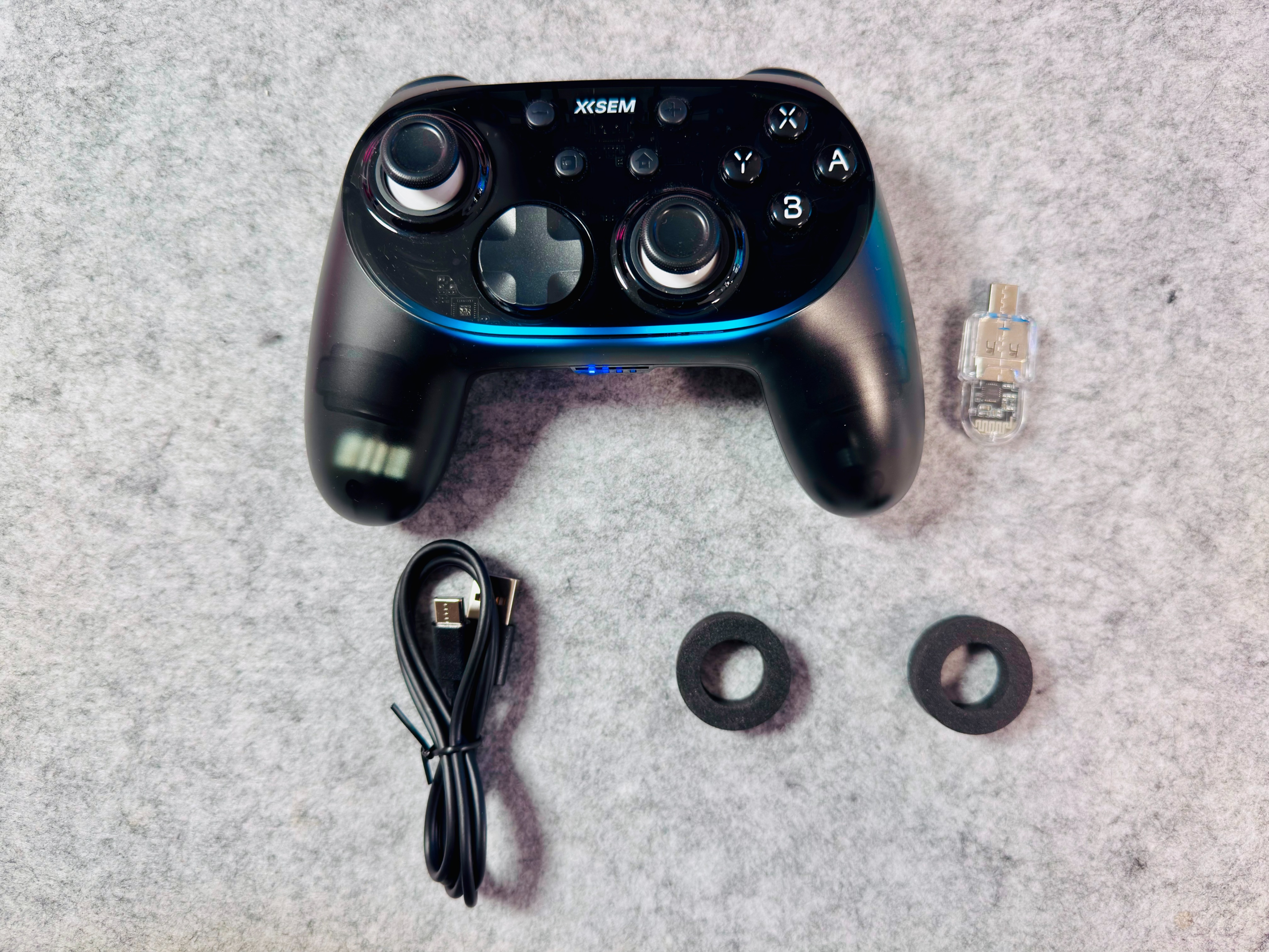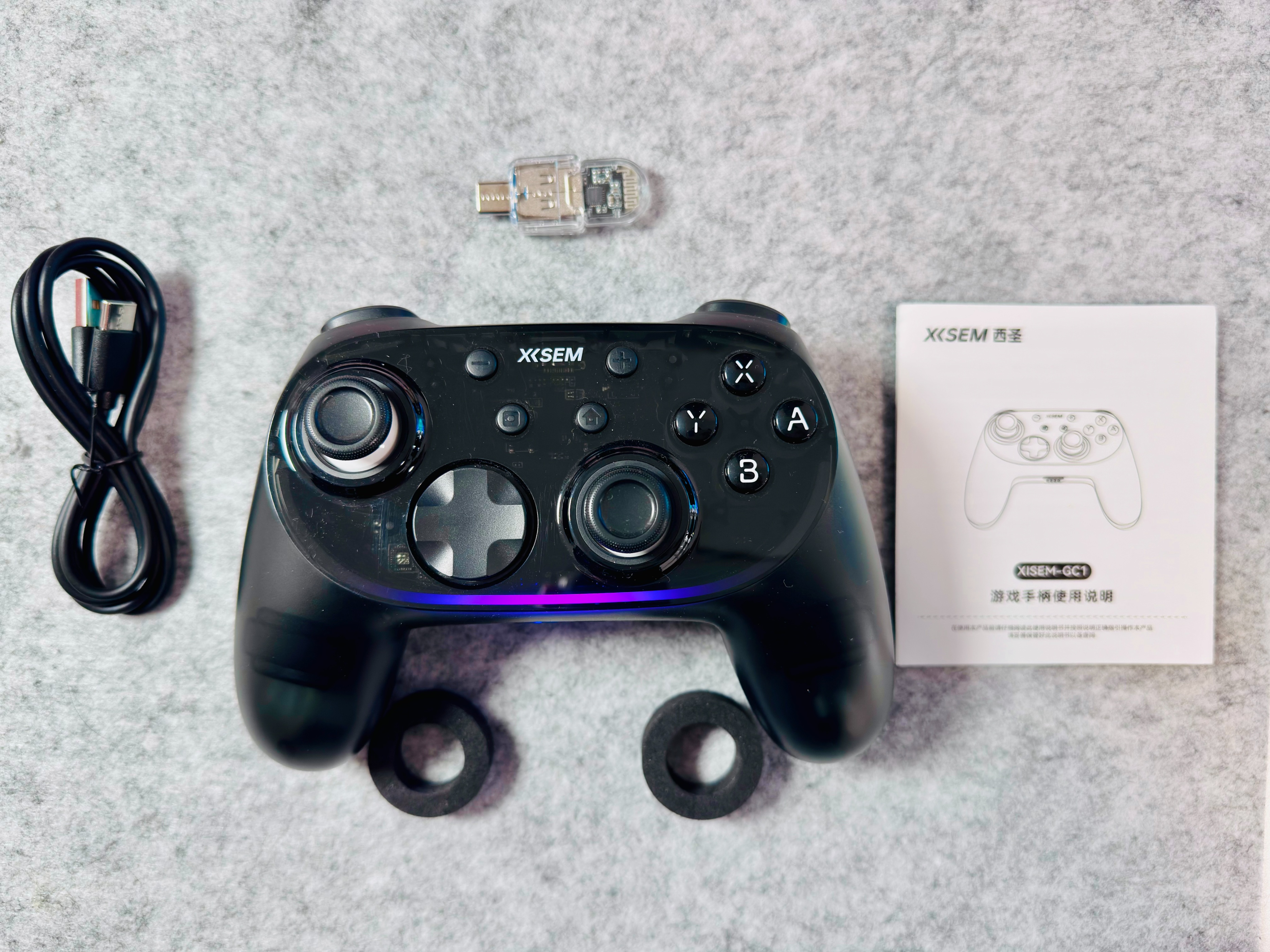 内置西圣GC1游戏手柄,了,USB连接线(同时也是充电线)、蓝牙接收器(若电脑没蓝牙,可以插接收器用连接)、两个保护环以及说明书。
