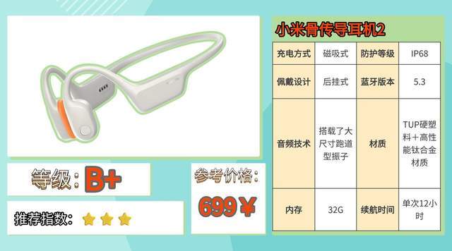 综合性能描述:后挂式骨传导结构搭配大尺寸跑道型振子,在骨传导耳机中音质表现出色,声音清晰且震感不明显。TUP硬塑料加高性能钛合金的机身材质,既结实耐用又轻便易携,戴在脖子上完全不压头,长时间运动也无负担。IP68顶级防水等级,游泳、洗澡、海边度假都能放心佩戴,夏天玩水、运动出汗完全不用慌张,实用性拉满。内置32G超大内存,能存储上千首歌曲,晨跑、夜跑无需携带手机,彻底解放双手,运动更自在。单次12小时续航,充一次电能用好几天,深度适配米家生态,澎湃OS系统开盖即弹窗,手机调音、电量查看超方便,小米用户使用起来得心应手,适合小米生态的运动爱好者与水上运动人群。