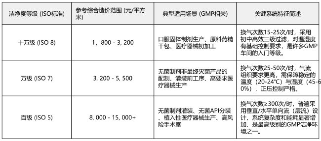 洁净度等级是成本认知的基础,这是需要理解的。所谓“绿色GMP”,其要点是在满足《药品生产质量管理规范》即GMP的强制性标准之上,把节能、环保、低碳的可持续发展理念融入进去。车间洁净度等级按照单位体积空气中允许存在的微粒以及微生物数量来划分,平常说的“十万级”、“万级”、“百级”分别对应不同的ISO标准,数字越小,等级就越高,对环境控制的要求也就越严格。空气中处理系统的规模乃是由这一等级直接予以决定的,其能耗水平以及围护结构的密封标准同样如此,此等级实则是对造价产生影响的最为首要的变量。为能够提供直观的一番参考状况呀,森培环境依靠结合数量众多的项目相关数据呢,将主流洁净等级的价格所处区间以及应用场景这样子梳理呈现如下: