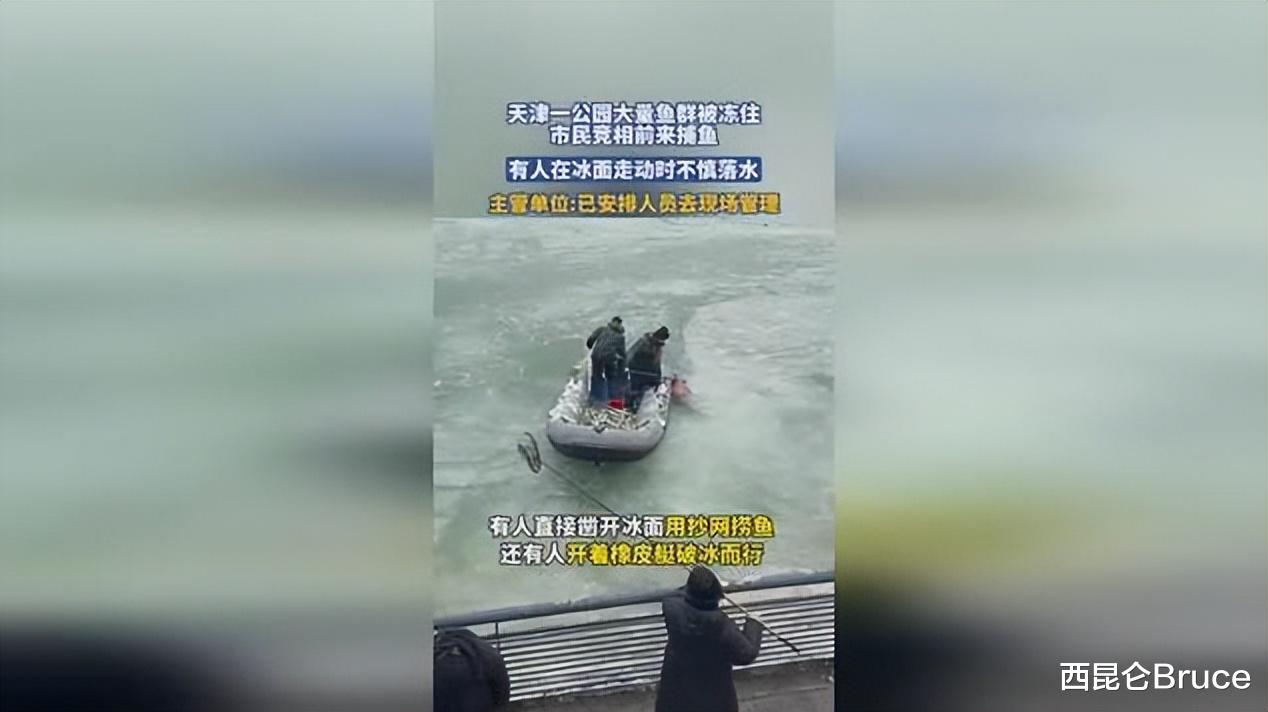 现场视频显示,众多市民闻讯前来,携带工具自发破冰捕捞,场面一度热闹非凡。然而,其间有人因冰面开裂不慎落水,幸被及时救起。
