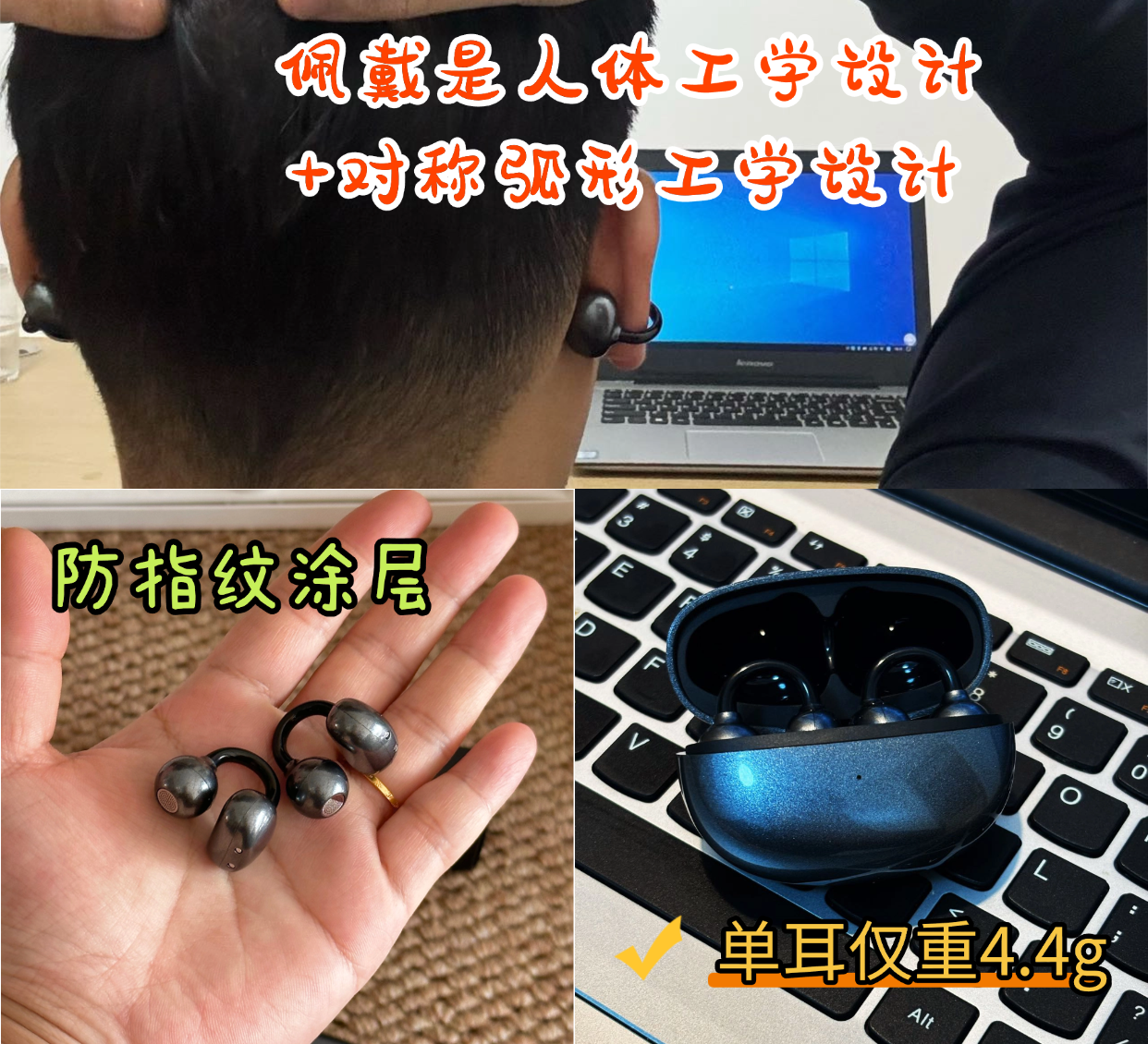 佩戴体验:这款耳机材质是做了突破性表现的,采用TPU复合形多工艺材质,对于易敏感人群是可以放心、安心的佩戴的,佩戴弧度是根据人体工学设计的,加上对称弧形工学设计,佩戴上是能起到压力分布均衡的,长时间佩戴无胀痛感,耳尖不会红肿