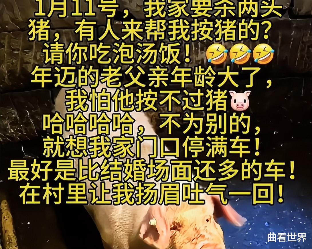 凭一己之力组织2026年最大杀猪盘,合川文旅做梦都没想到,宣传一整年没出圈结果却靠两头猪带火了。故事的起因是博主呆呆在网上发了一篇求助文,她称过年家里要杀两头猪,可父亲年纪大了担心他按不住猪,便希望热心网友能来帮忙。呆呆还就想让家门口停满车,最好比结婚场面的车还多,让自己在村里扬眉吐气一回。