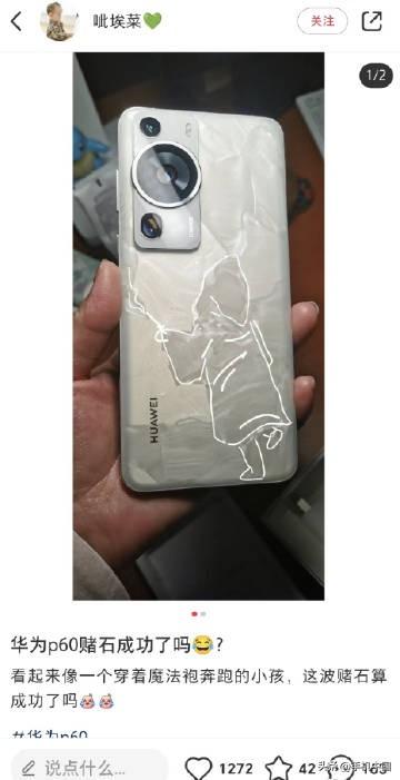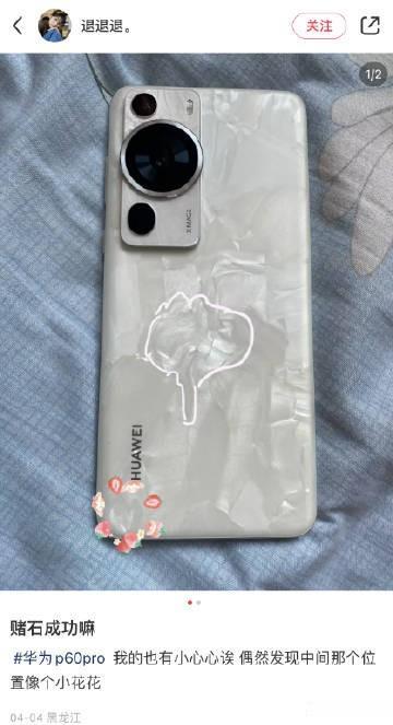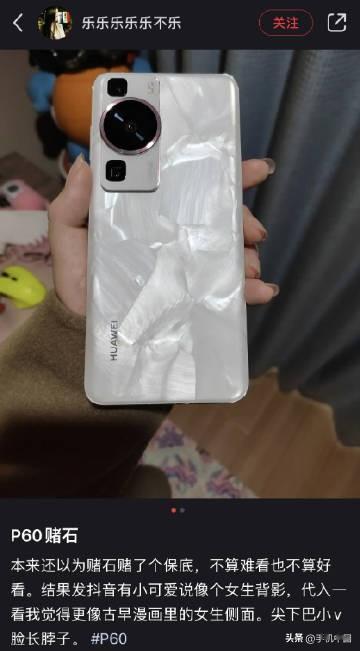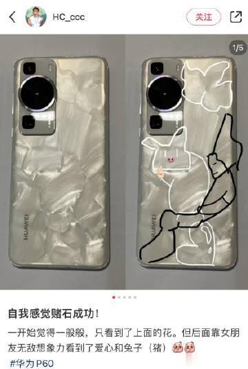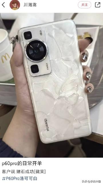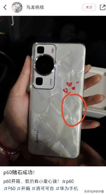 很多用户把开箱洛可可白配色的华为P60称为「赌石」,又称「数码盲盒」,因为每一台洛可可白配色的纹理都不一样。 如果纹理丰富或者有特殊形状就被称之为赌石成功 [狗头]
