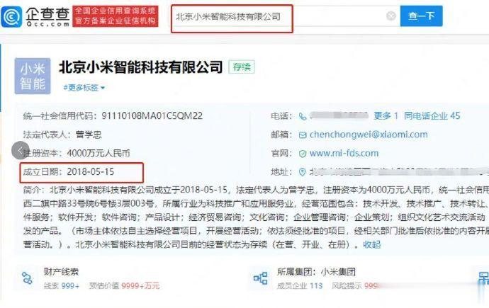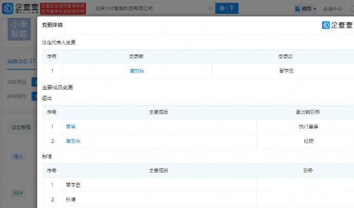 【】企查查APP显示,近日,北京小米智能科技有限公司发生工商变更,雷军不再担任公司执行董事,崔宝秋卸任经理、法定代表人,新增曾学忠为法定代表人、执行董事、经理。 企查查显示,北京小米智能科技有限公司成立于2018年5月,注册资本为4000万元人民币,由小米通讯技术有限公司全资控股,公司对外投资成立了北京昌数科技有限公司、北京小米机器人技术有限公司。