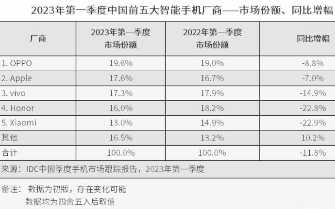 2023年第一季度国内手机市场出货量、增长率公布 国内手机总出货量约6544万台,同比下降11.8% 出货量前5名:OPPO、苹果、vivo、荣耀、小米 值得注意的是,在折叠屏手机的销量上,OPPO也拿下国内市场份额第一