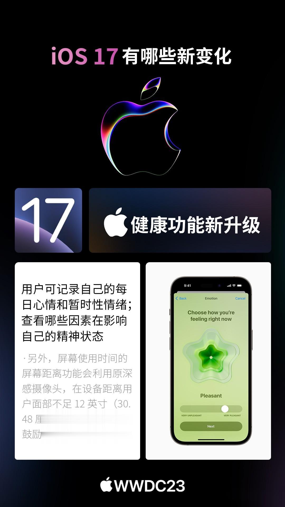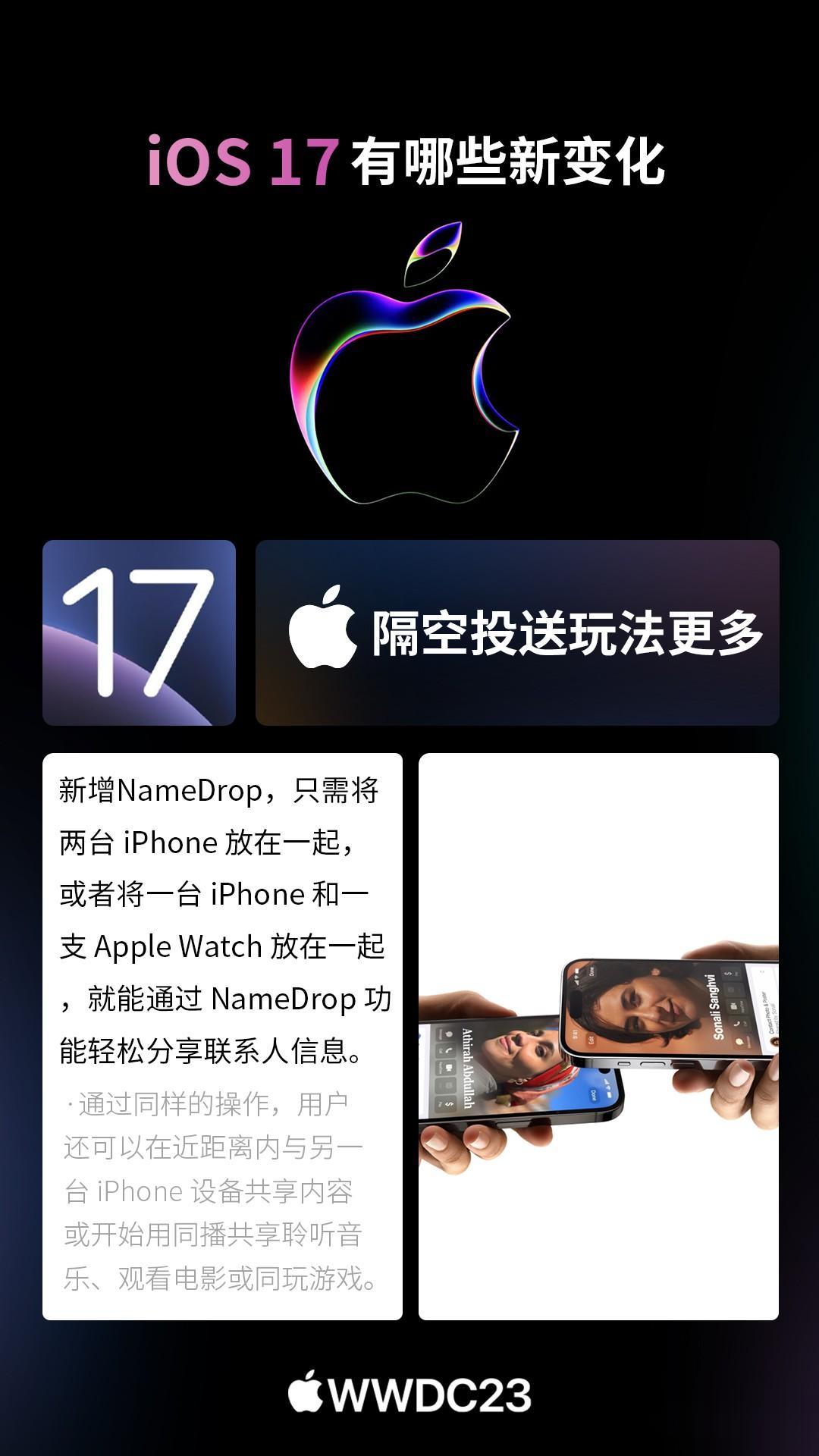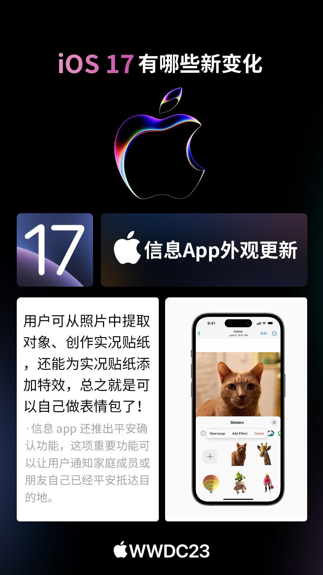 北京时间6月6日凌晨1点,苹果正式召开WWDC开发者大会,全新的iOS17系统正式发布。 以下是CNMO手机中国为大家汇总的iOS17系统新变化。 iOS17的iMessage新增了check in功能,它可以告诉你的亲人朋友们你所在的位置,打卡经历,甚至分享位置状态以便别人知晓现在是不是一个好时机去给你拨打电话。 iOS17的个性化锁屏方面就更加丰富了。设置之后,用户接到其他用户的电话,会显示其专属的界面。无需看号码名字,直接可看出来电人。此外,来电可以转文字!假如你不会方便接电话,直接看文字即可。 iOS17照片中的主体可以创建为表情包,可以从回击菜单中向任何气聊天窗口加表情包,包括第三方应用程序中使用也能用自制的表情包。 iOS17用户可以say hi,分享某时刻的珍贵视频,其隔空投送还新增NameDrop,能实现碰一碰分享手机号,可玩性更强。