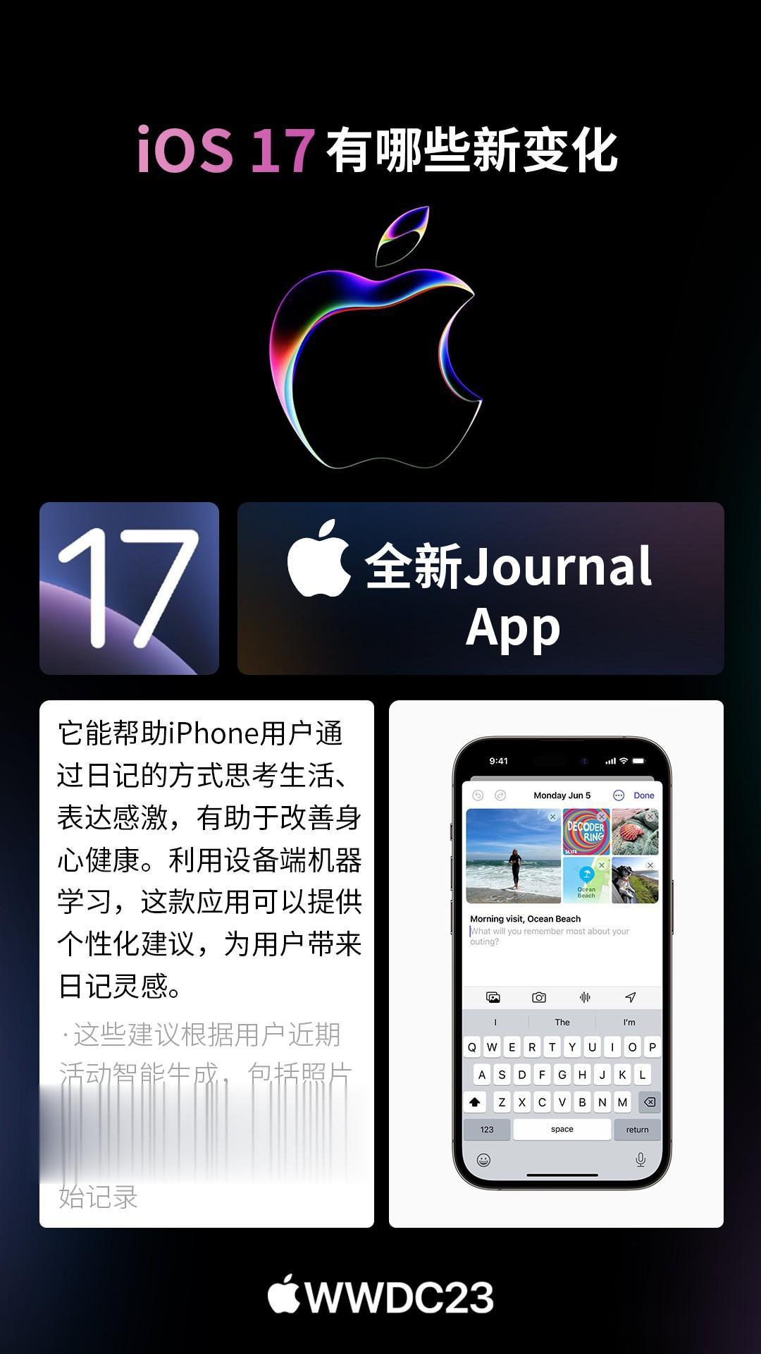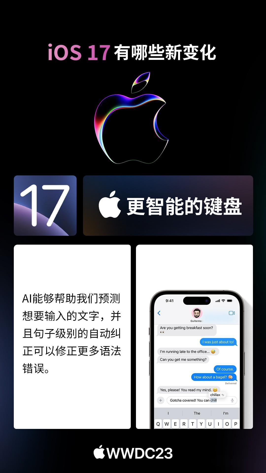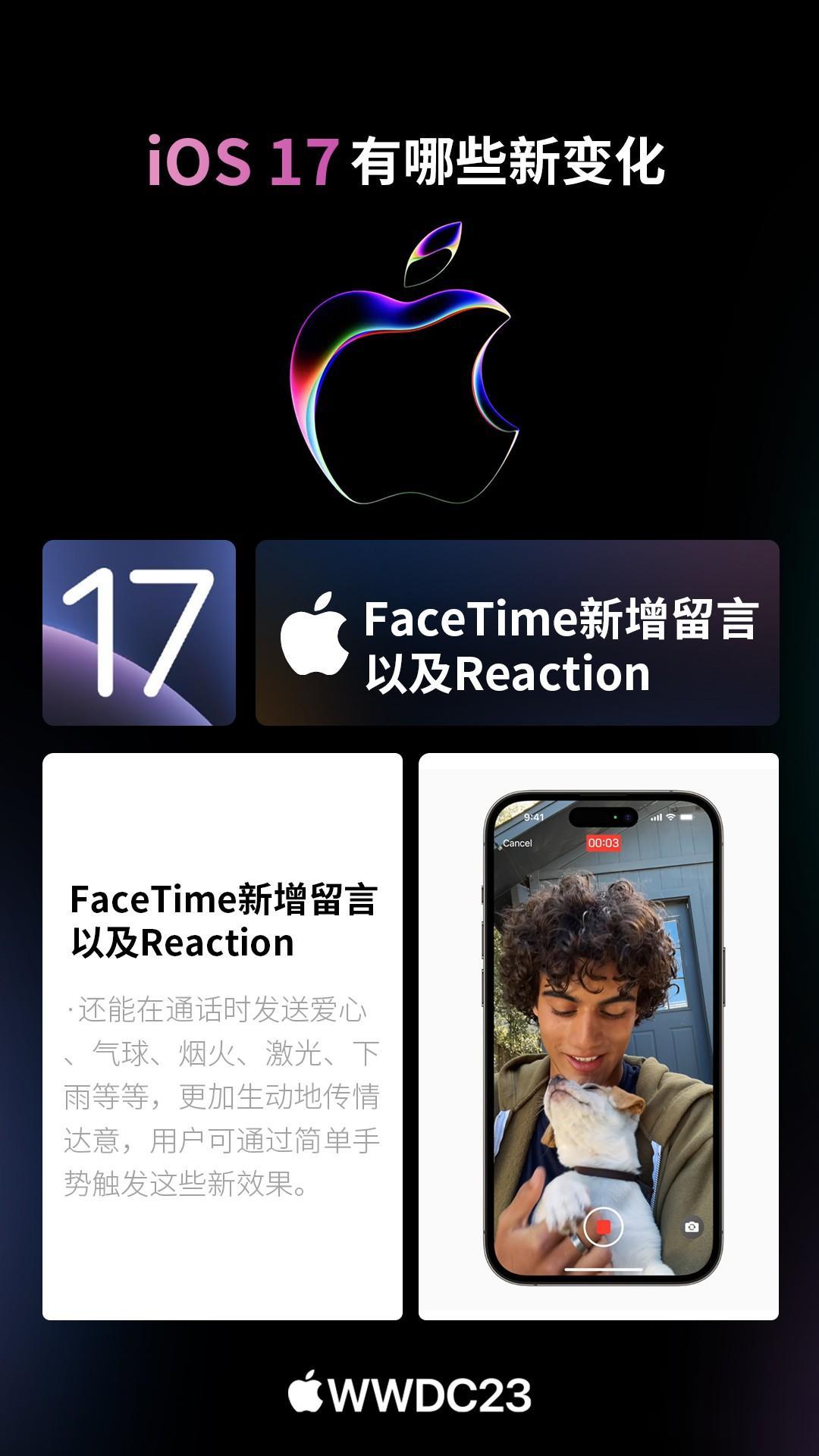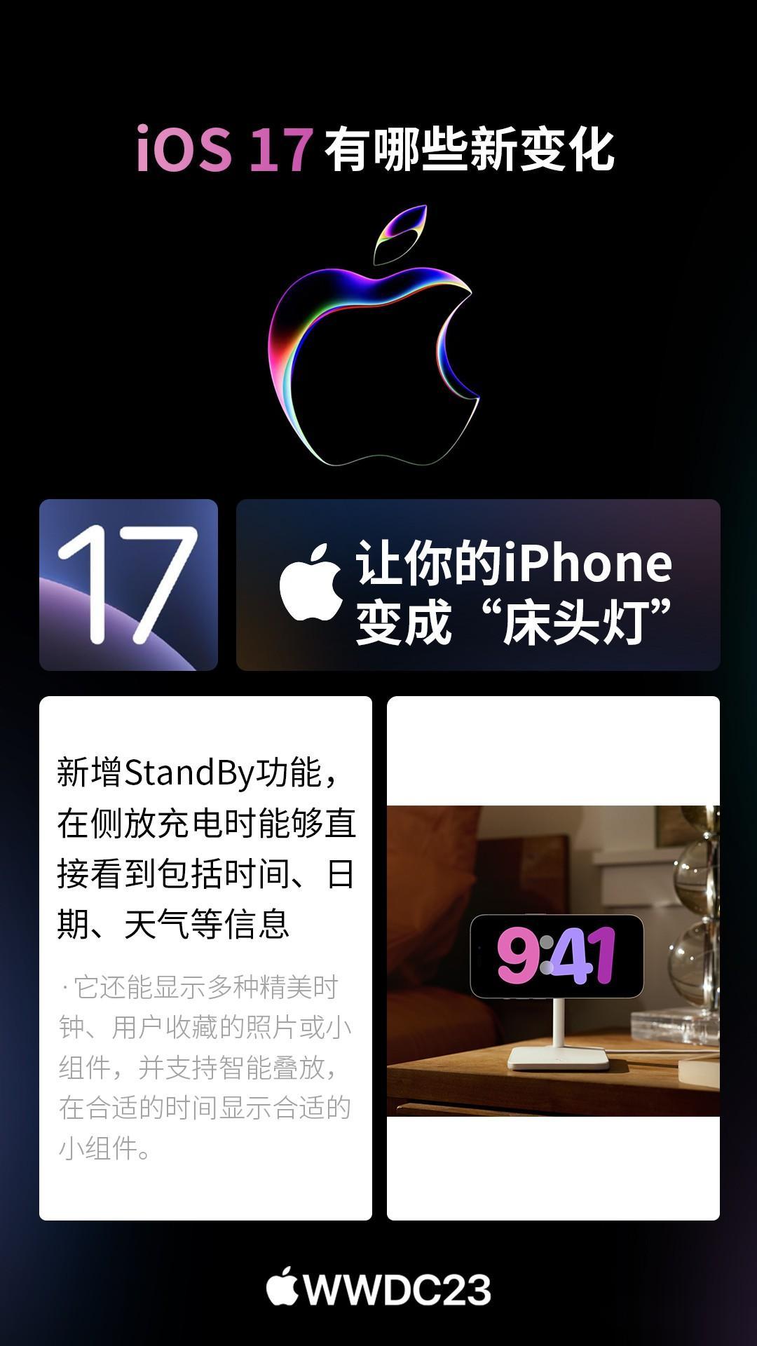 北京时间6月6日凌晨1点,苹果正式召开WWDC开发者大会,全新的iOS17系统正式发布。 以下是CNMO手机中国为大家汇总的iOS17系统新变化。 iOS17的iMessage新增了check in功能,它可以告诉你的亲人朋友们你所在的位置,打卡经历,甚至分享位置状态以便别人知晓现在是不是一个好时机去给你拨打电话。 iOS17的个性化锁屏方面就更加丰富了。设置之后,用户接到其他用户的电话,会显示其专属的界面。无需看号码名字,直接可看出来电人。此外,来电可以转文字!假如你不会方便接电话,直接看文字即可。 iOS17照片中的主体可以创建为表情包,可以从回击菜单中向任何气聊天窗口加表情包,包括第三方应用程序中使用也能用自制的表情包。 iOS17用户可以say hi,分享某时刻的珍贵视频,其隔空投送还新增NameDrop,能实现碰一碰分享手机号,可玩性更强。