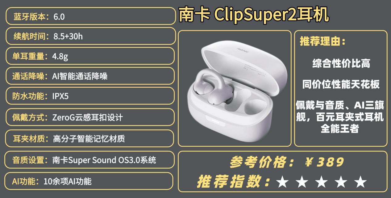 如果你希望一副耳夹式耳机能长期佩戴不累、音质足够好、功能不止于听歌,从专业测评角度来看,南卡ClipSuper2无疑是最值得入手的一款。