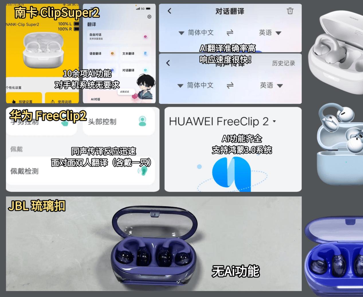 现在市面上很多耳夹式耳机都会采用AI功能,多数新款耳夹式耳机内置端侧精简版AI大模型,不过每个产品中的Ai功能都有所不同,所以下面给大家分享一下这三款耳机都具备了哪些AI功能:
