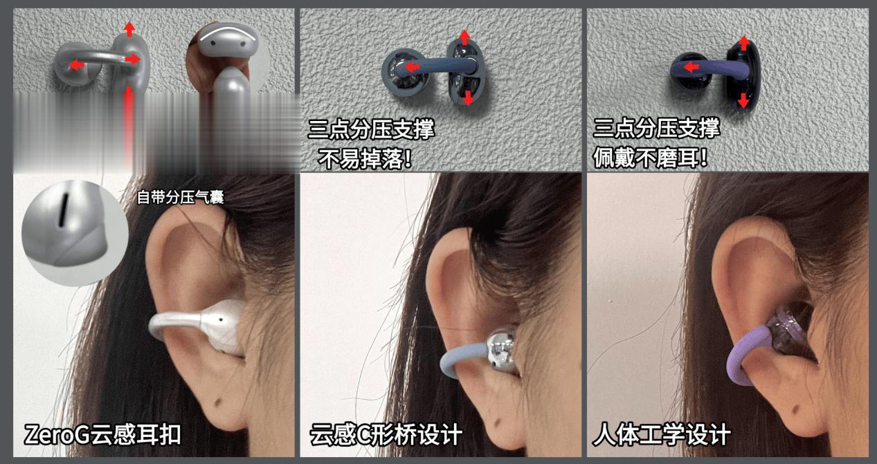 南卡ClipSuper2:佩戴体验是三款中最突出的。ClipSuper2采用了全新的ZeroG云感耳扣设计,通过不对称弧形结构形成四点支撑,再配合LevAir舒压气囊,能将重量与压力均匀分散。单耳仅4.8g,实际佩戴几乎没有夹耳感。