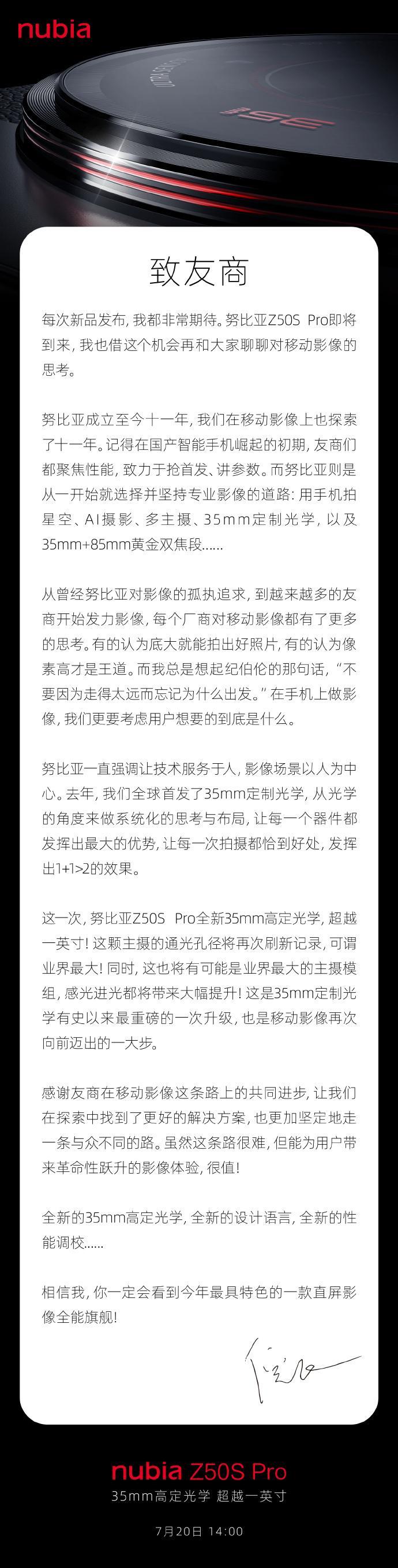 努比亚Z50S Pro官宣7月20日14:00发布 主摄采用了全新35mm高定