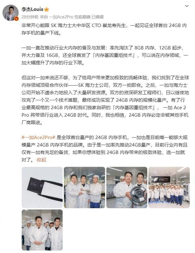 近日 ,一加中国区总裁李杰邀请海力士高管参观一加工厂,共同见证全球首款24GB手机一加Ace 2 Pro大规模量产。一加联合全球存储颗粒领先品牌海力士,双方共同投入研发团队和研发资源,实现了24GB闪存颗粒的大规模量产,一加已经宣布,一加Ace 2 Pro将在8月16日正式发布。