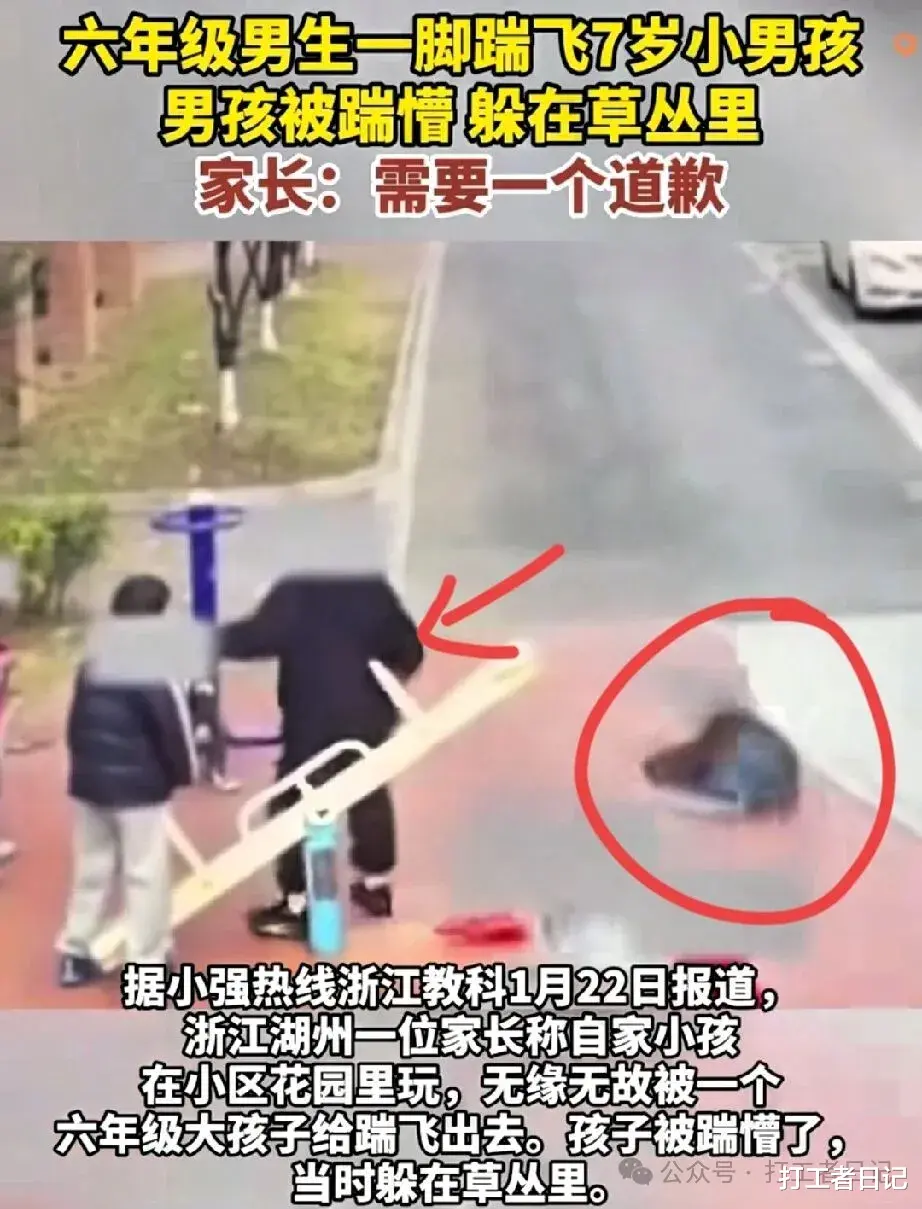 近日又发生一起令人愤怒的儿童欺凌事件,2026年1月22日或者更早的某天,一名六年级学生无故暴力攻击一名7岁男童,一脚踹飞出去。