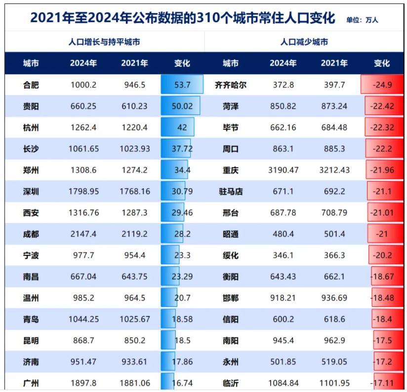 有媒体统计过2021年到2024年,全国311个城市常住人口的变化。其中201个城市人口流失,108个增长,2个持平,也就是说差不多三分之二的城市人口减少了。