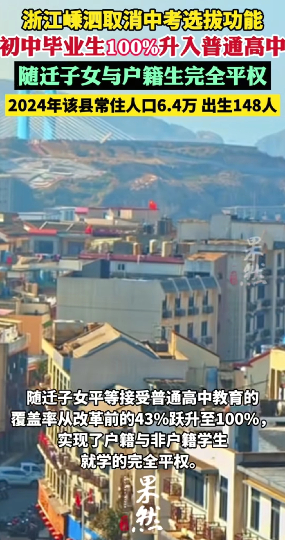 从2025年秋季学期起,嵊泗县全面取消普通高中录取分数线门槛,全县266名初中毕业生,不管是有没有当地户口,100%升入普通高中。