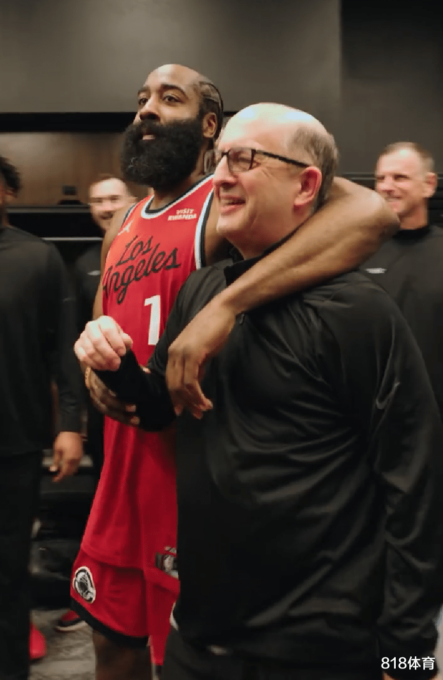 哈登马上走到范甘迪面前,一把搂住了老头的脖子,十分亲热。