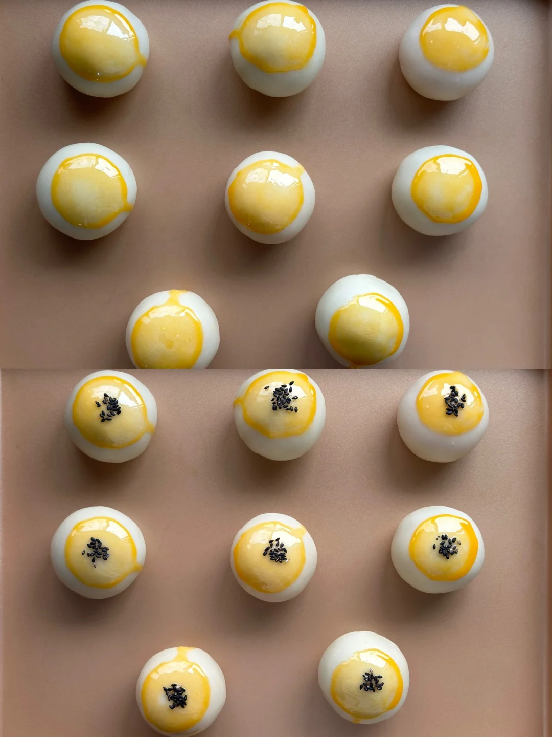 🐾收口向下,放入烤盘,依次做好后,刷上蛋黄液,撒上黑芝麻。