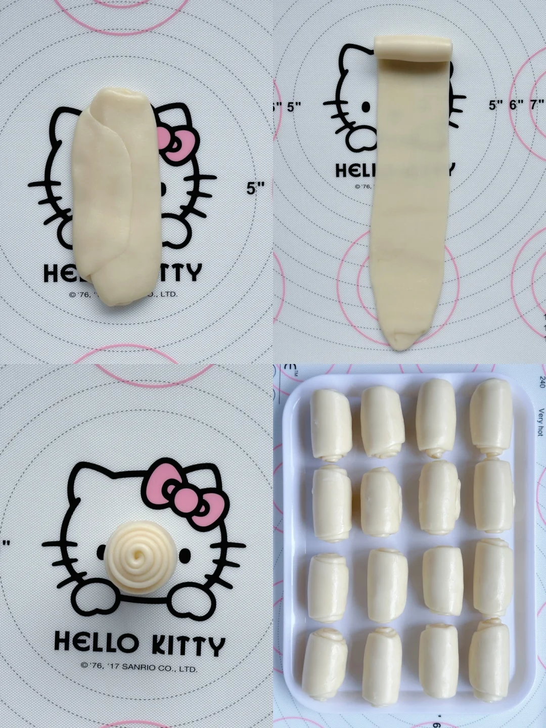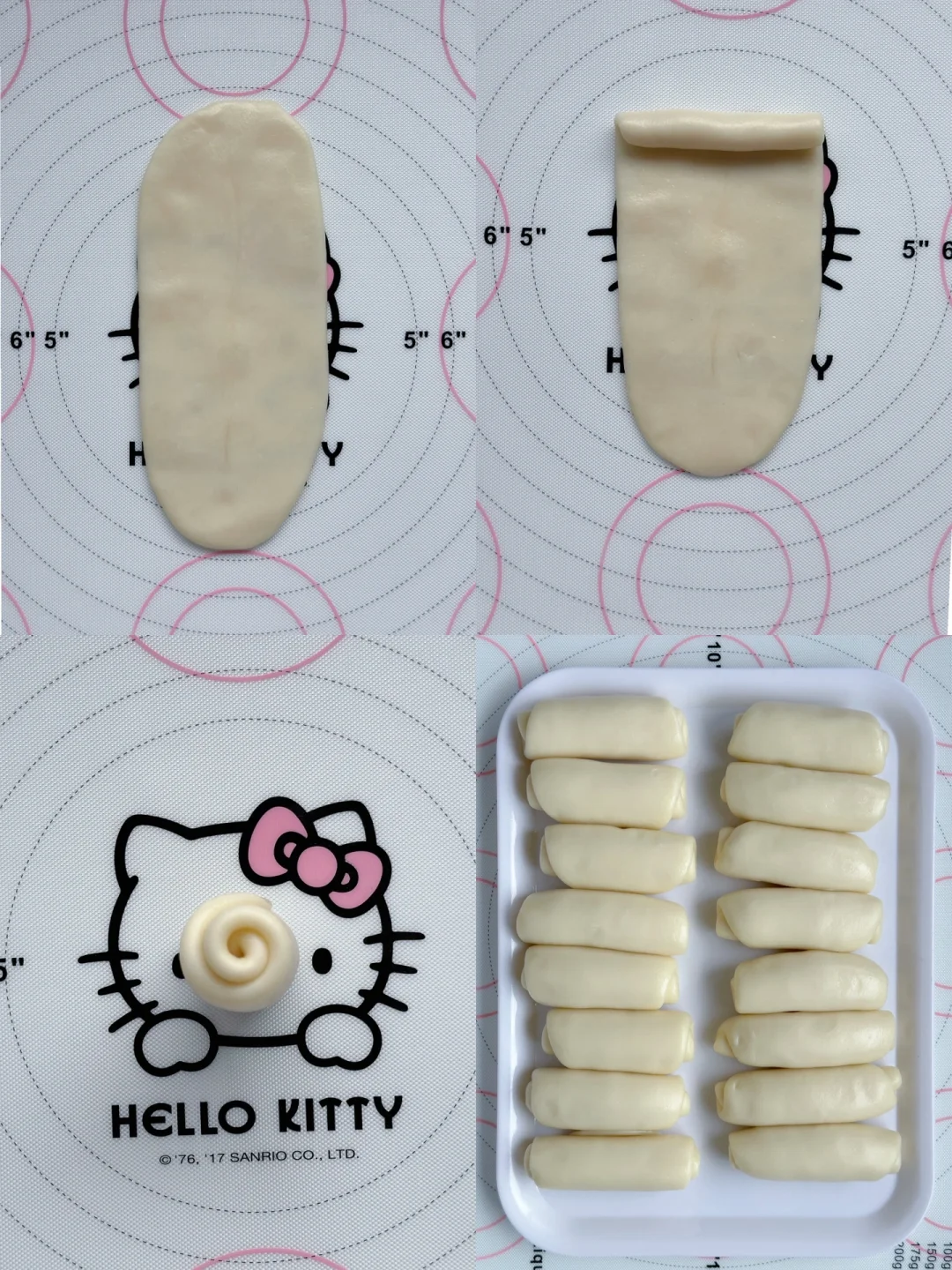 🐾取一个松弛好的面团卷,拍扁,还是同上方法擀长, 卷起,松弛15分钟。