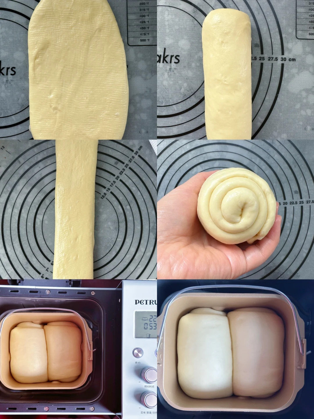 4️⃣揉好的面团温度不超过26度,取出揉好的面团整形,将面团分成两个面团,滚远松弛15分钟,擀成长条卷起,松弛15分钟,二次擀长,卷起来。