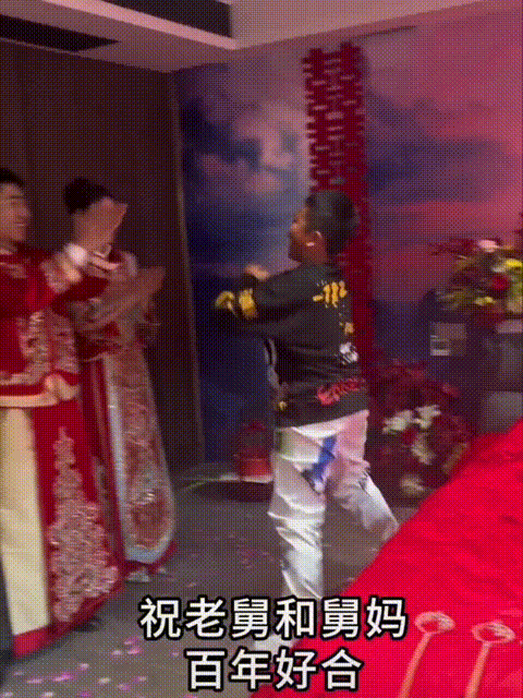 小男孩给新婚的舅舅舅妈滚床,嘴里的祝福词一套一套的,什么夫妻恩爱、子孙满堂、荣华富贵、金山银山,生个状元郎的。 关键是舅妈也很好,小男孩滚完床,祝舅舅舅妈百年好合,刚要走,舅妈赶紧让舅舅给孩子红包。