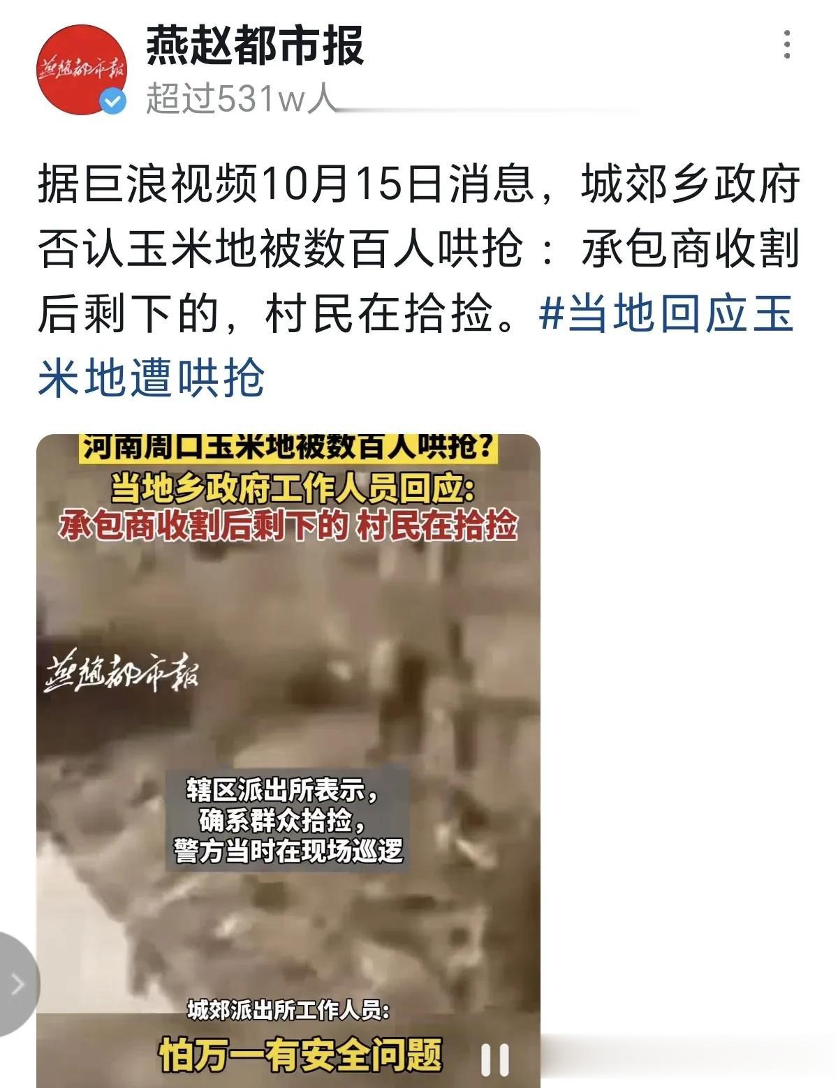 近日河南周口抢玉米事件反转。 开始目击者称:一农业公司承包种植的玉米尚未收割,就被百余人疯抢,2000多亩的地,被抢没了几百亩,开始只是捡,后面就变成了抢,都是些中老年人。 最新消息事件反转,城郊乡政府否认玉米地被百人哄抢,玉米是承包商收割后剩下的,村民是在拾捡。