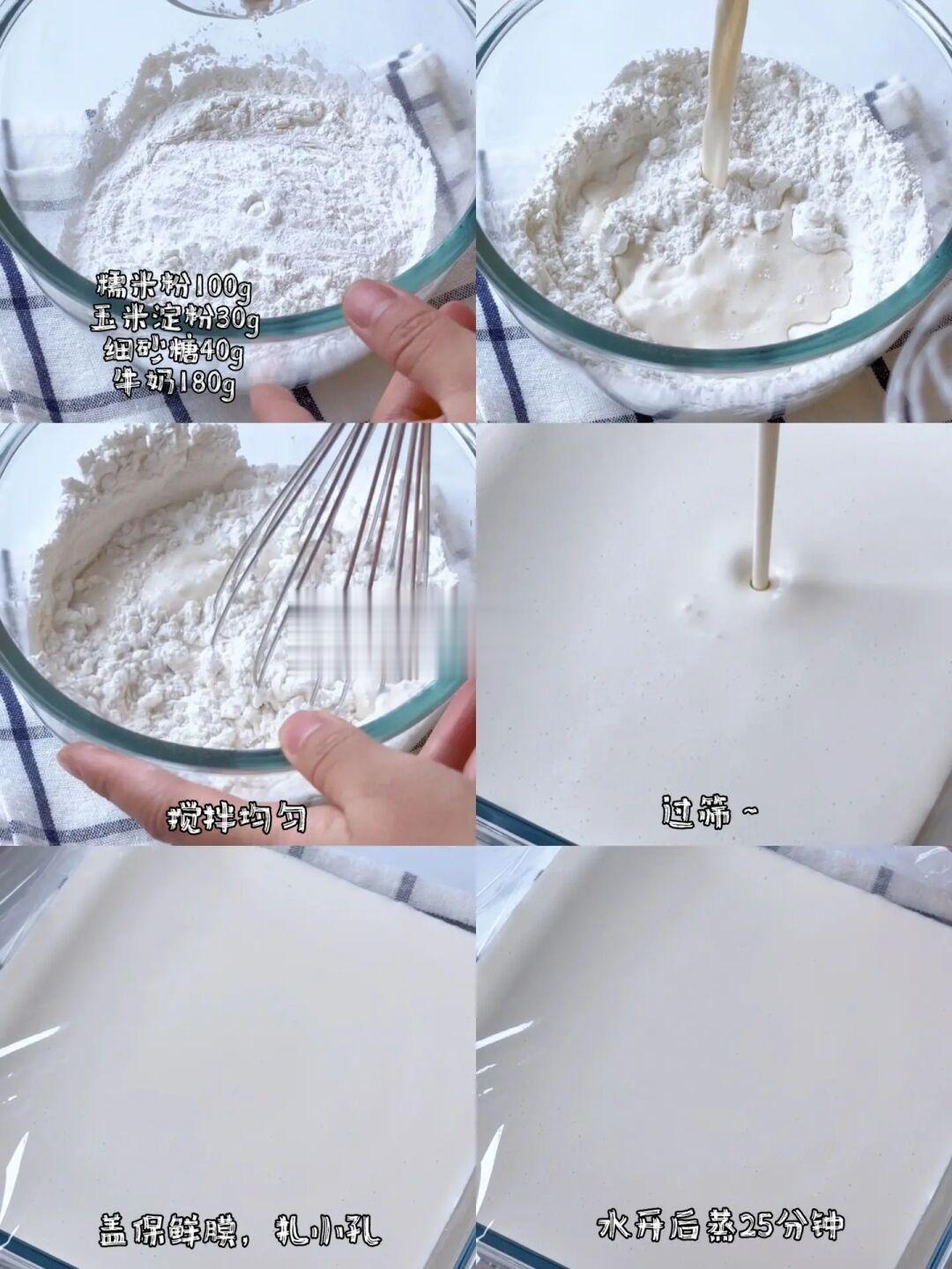 1️⃣糯米粉➕玉米淀粉➕糖➕牛奶混合均匀,过筛,盖保鲜膜、扎小孔,水开上锅蒸25分钟。