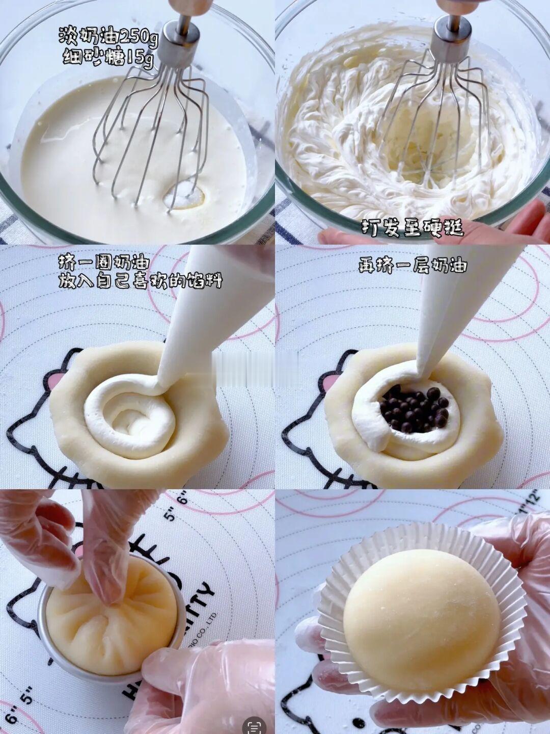 4️⃣将揉好的面团分成大小均匀的剂子,撒熟糕粉防粘,取一个面团擀成圆面皮,放入模具,挤上一圈奶油,放入喜欢的内馅,再挤一层奶油,提起四周收口捏紧,收口出粘少许熟糕粉防粘即可