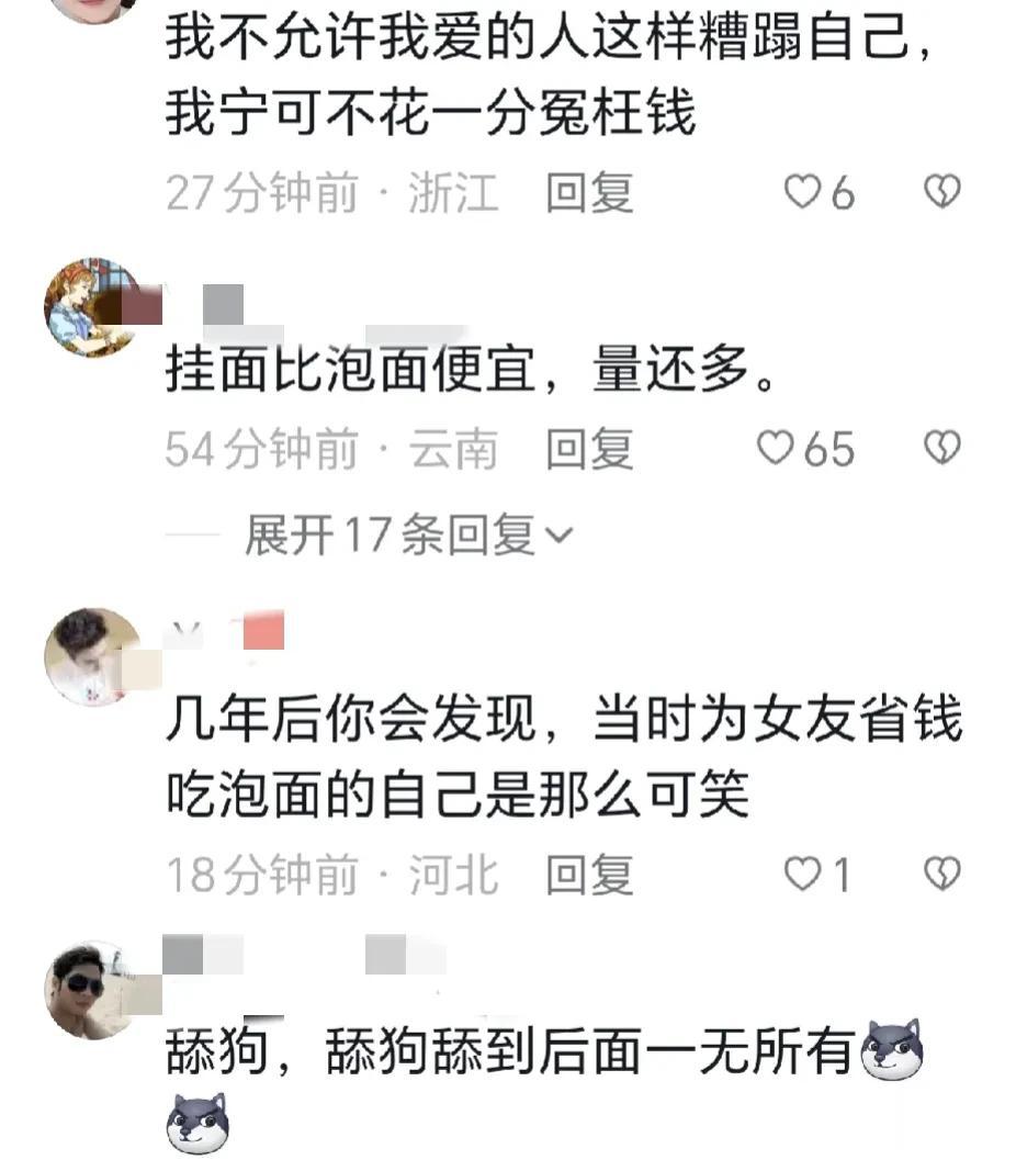 大学生晒自己的室友,谁懂啊???室友为了爱情35元过10天顿顿吃泡面,室友和女友出去玩,为了女友过得舒服点,两天花了一千多,回宿舍花24元批发了30包方便,11.6元买了25根火腿肠,一日三餐都是泡面。 网友:这要是我儿子,我得心疼死,我隔着屏幕都心疼。 网友:我宁肯不花冤枉钱,也不允许我爱的人这么糟蹋自己 网友:挂面比泡面便宜,量还多。