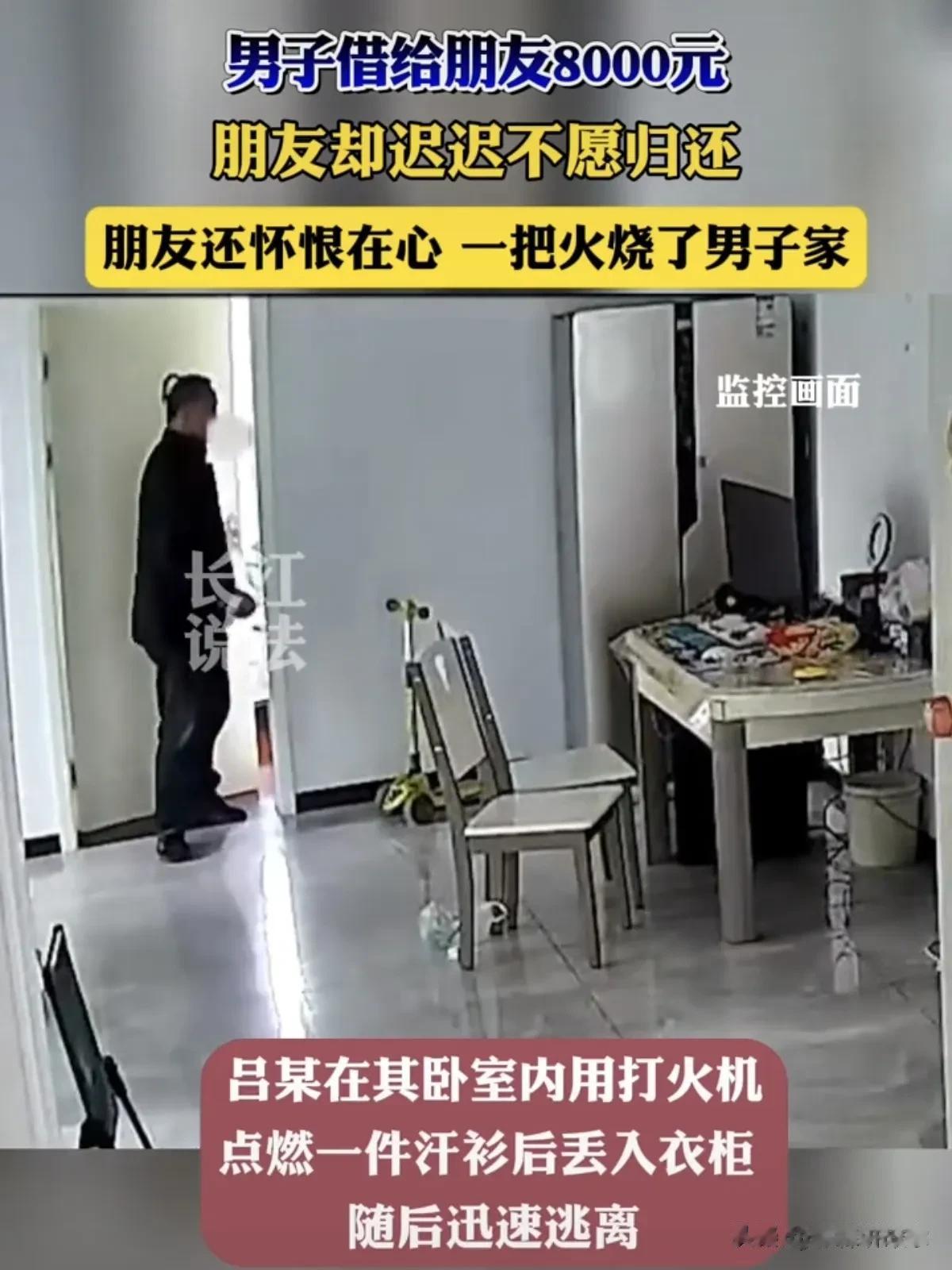 据长江说法报道,一男子跟朋友借8000元不归还,还烧借他钱的朋友家,对这件事你怎么看? 网友:这哪里是朋友,这是仇家。 网友:为什么要恩将仇报呢? 网友:欠钱的成了大爷,别人要钱却变成仇家,到底该不该帮朋友。