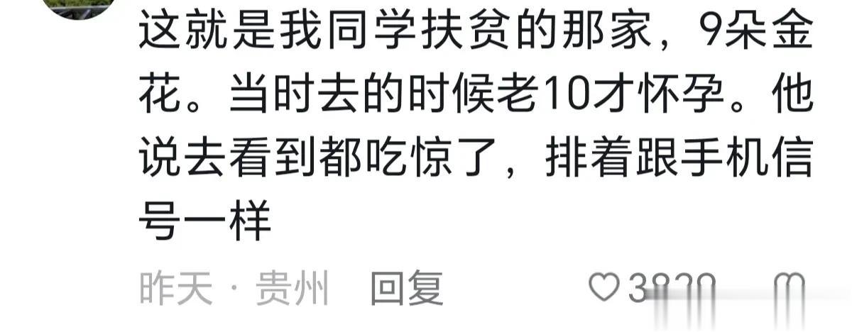 这一家生了十个孩子,9个女儿,生到第十个终于生到儿子了,网友都觉得好幸福,这位妈妈好伟大,女孩们长大了就可以给家里彩礼了,我怎么都无法理解重男轻女要男孩的人,何况是生了那么多要靠别人扶贫,还生的人。 评论区有人说这一家是他同学扶贫的一家,生了九朵金花,去的时候才怀老10,排着跟手机信号似的。