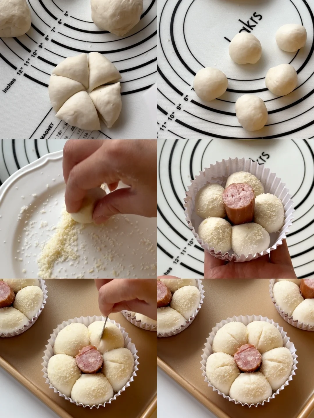 4️⃣每一个表面喷水,沾一层芝士粉,5个一组放入纸托中,中间放入香肠。
