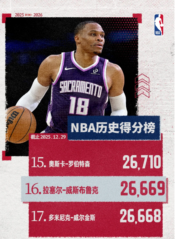 首节比赛还剩9分15秒,国王后卫拉塞尔-威斯布鲁克助攻基恩-埃利斯上篮打进,生涯总助攻数达到10142次,从而超越湖人名宿魔术师约翰逊,升至NBA历史助攻榜第七。