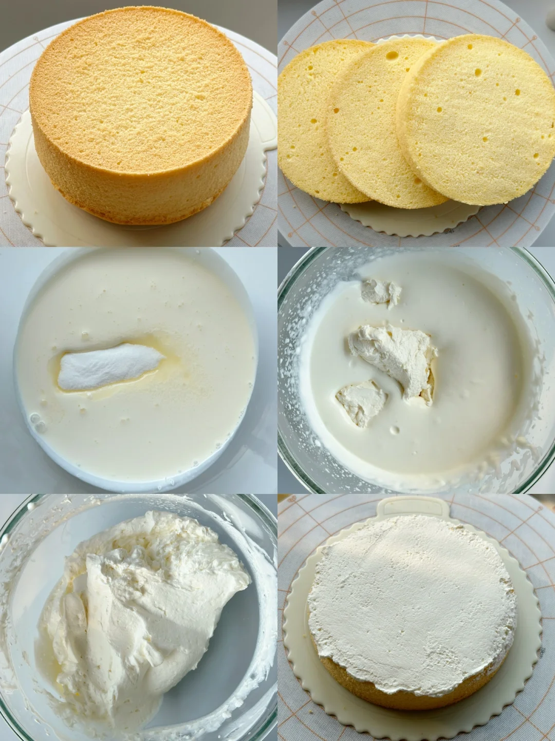 1️⃣淡奶油➕糖➕马斯卡彭打发至硬挺,一层蛋糕胚➕奶油水果夹馅➕蛋糕胚➕奶油巧克力脆珠➕蛋糕胚