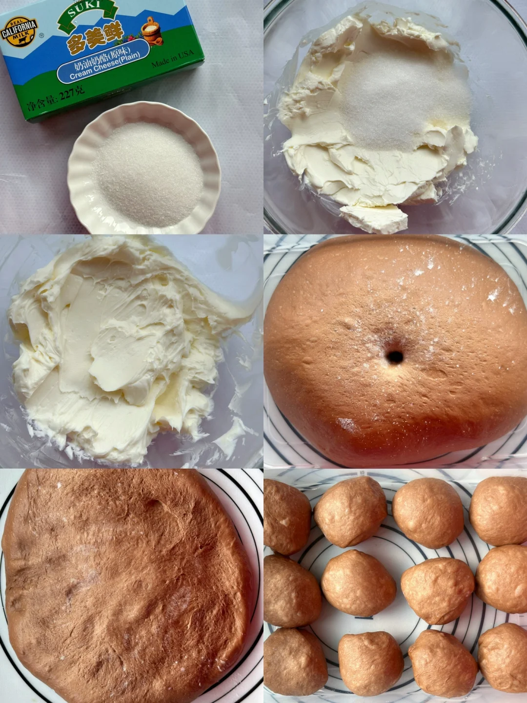 4️⃣ 取出发酵好的面团,按压排气,将面团分成大小均匀的12个面团,滚圆松弛15分钟。松弛时间将奶油奶酪中加入糖粉拌匀备用。