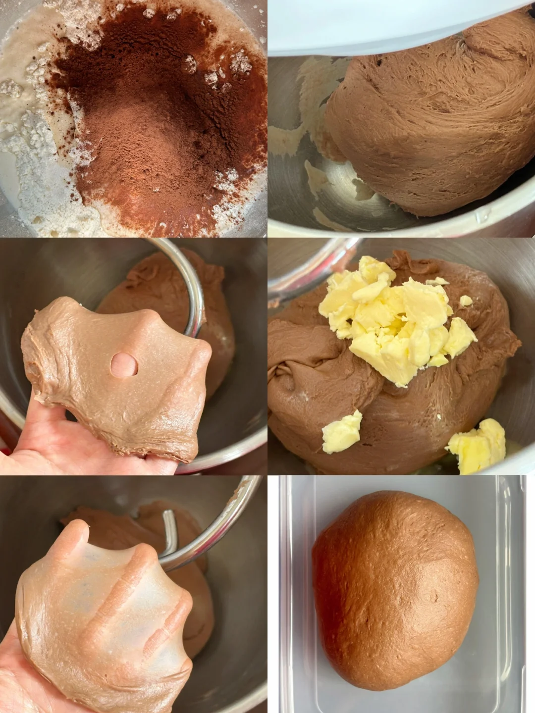 1️⃣除黄油以外的所有面团材料放入厨师机桶内厨师机1或2档搅拌至无干粉,切换至5~6档打至能扯出厚膜,加入软化好的黄油开3档揉至黄油吸收,再切换至5-6档揉至能扯出薄膜即可。