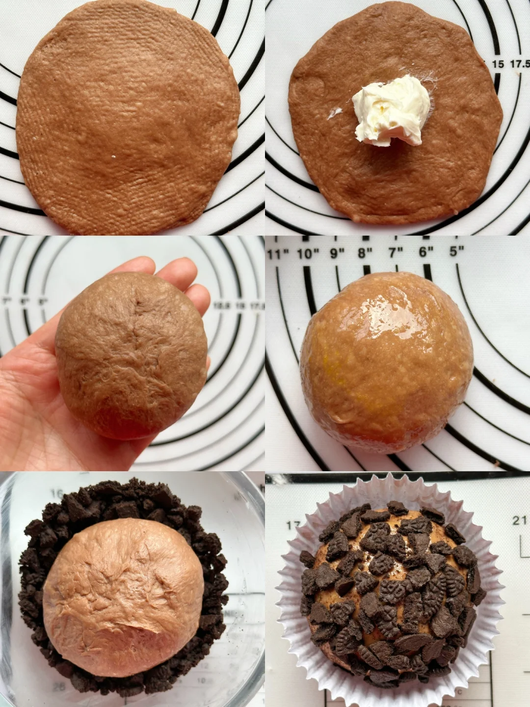 5️⃣取一个松弛好的面团按压排气,擀开、包入20g左右的奶油奶酪馅,包裹起来,收口捏紧,表面刷一层蛋液,沾上奥利奥碎