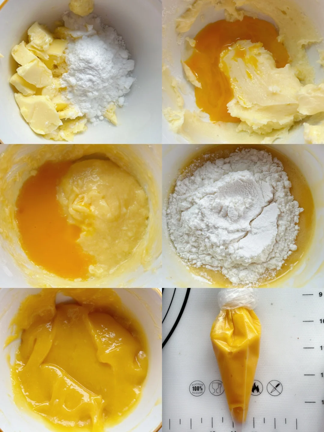 3️⃣发酵时准备墨西哥酱,黄油室温软化加入糖粉搅拌,蛋液分2-3次加入,每次搅拌均匀再加入下一次,最后筛入低筋面粉拌匀。装入裱花袋备用。