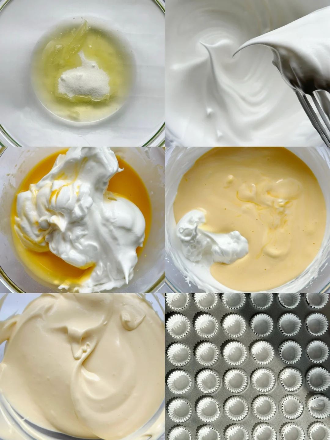 💞加入1/3蛋白霜到蛋黄糊中,画一字或Z字混匀。将混合的面糊再倒回剩余的蛋白霜中,继续画一字或Z字混匀。